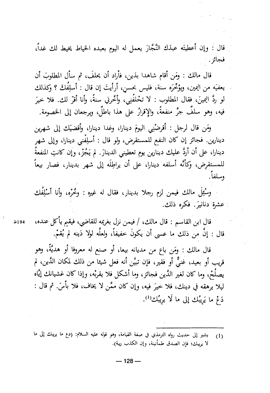 قال مالك: ومن باع من مديانه بيعًا، أو صنع له معروفًا أو هدية، وهو قريب أو بعيد، غني أو فقير، فإن تبين أنه فعل شيئًا من ذلك لمكان الدين، لم يصلح، وما كان لغير الدين فجائز، وما أشكل فلا يقربه، وإذا كان غشيانك إياه ليلا يرهقه في دينك، فلا خير فيه، وإن كان ممن لا يخاف، فلا بأس. ثم قال: دع ما يريبك إلى ما لا يريبك.