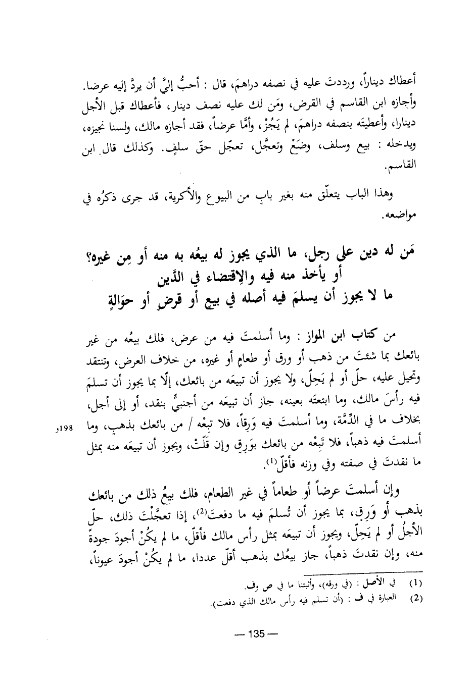 وإن أسلمت عرضًا أو طعامًا في غير الطعام، فلك بيع ذلك من بائعك بذهب أو ورق، بما يجوز أن تسلم فيه ما دفعت، إذا تعجلت ذلك، حل الأجل أو لم يحل، ويجوز أن تبيعه بمثل رأس مالك فأقل، ما لم يكن أجود جودة منه، وإن نقدت ذهبًا، جاز بيعك بذهب أقل عددًا، ما لم يكن أجود عيونًا،