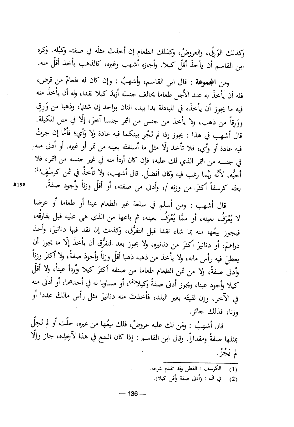 ومن المجموعة: قال ابن القاسم، وأشهب: وإن كان له طعام من قرض، فله أن يأخذ به عند الأجل طعامًا يخالف جنسه أزيد كيلاً نقدًا، وله أن يأخذ منه فيه ما يجوز أن يأخذه في المبادلة يدًا بيد، اثنان بواحد إن شئتما، وذهبا من ورق وورقًا من ذهب، ولا يأخذ من جنس من التمر جنسًا آخر، إلا في مثل المكيلة. قال أشهب في هذا: يجوز إذا لم تجر بينكما فيه عادة ولا وأي، فأما إن جرت فيه عادة أو وأي، فلا تأخذ إلا مثل ما أسلفته بعينه من تمر أو غيره، أو أدنى منه في جنسه من التمر الذي لك عليه، فإن كان أردأ منه في غير جنسه من التمر، فلا أحبه؛ لأنه ربما رغب فيه وكان أفضل. قال أشهب: ولا تأخذ في ثمن كرسف بعته كرسفًا أكثر من وزنه، وأدنى من صفته، أو أقل وزنًا وأجود صفة.