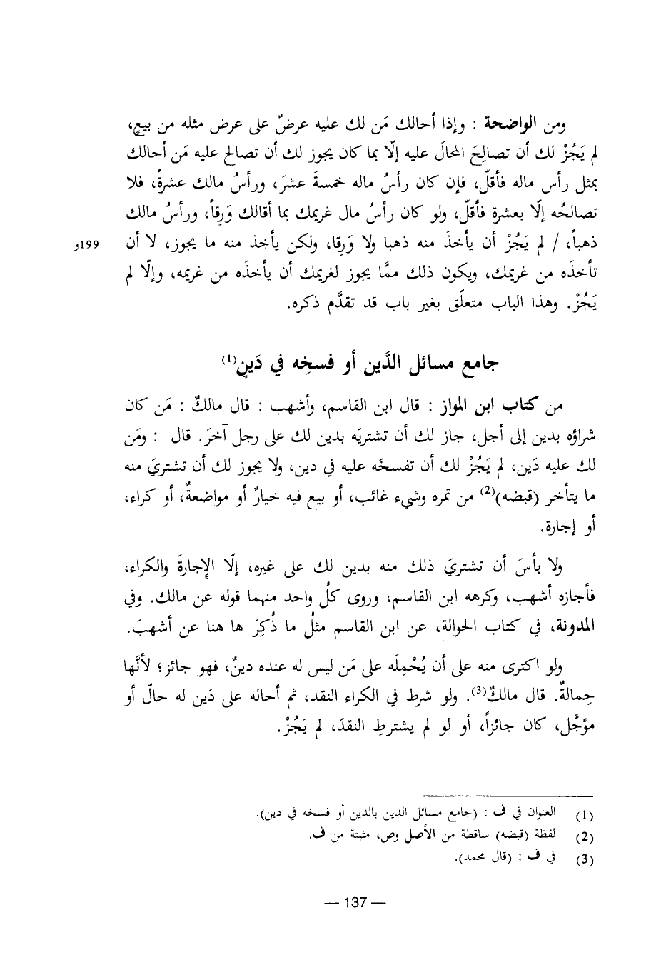 من كتاب ابن المواز: قال ابن القاسم، وأشهب: قال مالك: من كان شراؤه بدين إلى أجل، جاز لك أن تشتريه بدين لك على رجل آخر. قال: ومن لك عليه دين، لم يجز لك أن تفسخه عليه في دين، ولا يجوز لك أن تشتري منه ما يتأخر قبضه من تمره وشيء غائب، أو بيع فيه خيار أو مواضعة، أو كراء، أو إجارة.