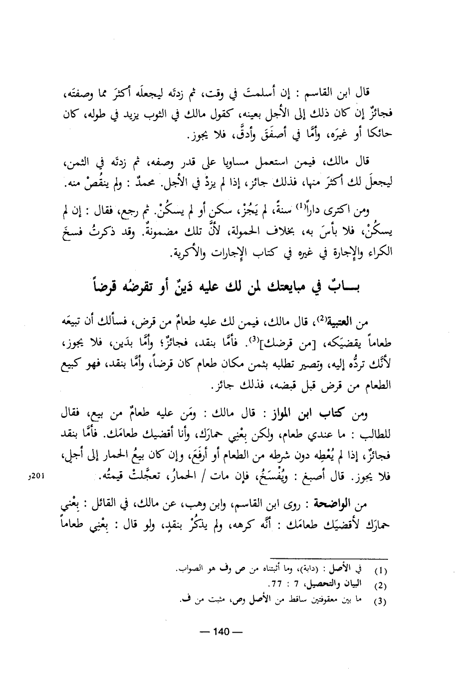 قال مالك فيمن استعمل مساويًا على قدر وصفه، ثم زدته في الثمن، ليجعل لك أكثر منها، فذلك جائز، إذا لم يزد في الأجل. محمد: ولم ينقص منه.