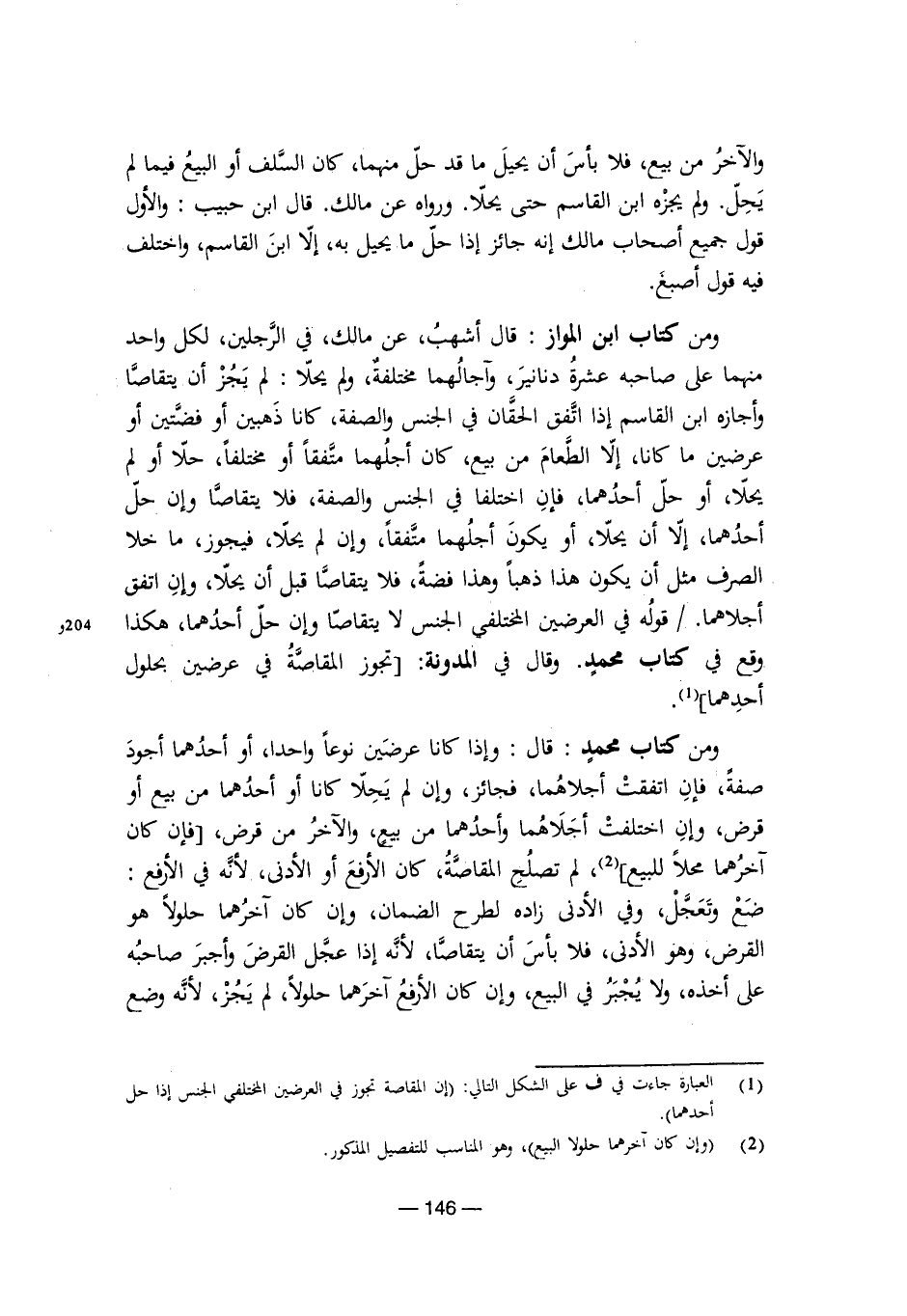 ومن كتاب ابن المواز: قال أشهب، عن مالك، في الرجلين لكل واحد منهما على صاحبه عشرة دنانير، وآجالهما مختلفة، ولم يحلا: لم يجز أن يتقاصا وأجازه ابن القاسم إذا اتفق الحقان في الجنس والصفة، كانا ذهبين أو فضتين أو عرضين ما كانا، إلا الطعام من بيع، كان أجلهما متفقًا أو مختلفًا، حلا أو لم يحلا، أو حل أحدهما، فإن اختلفا في الجنس والصفة، فلا يتقاصا وإن حل أحدهما، إلا أن يحلا، أو يكون أجلهما متفقًا، وإن لم يحلا فيجوز، ما خلا الصرف مثل أن يكون هذا ذهبًا وهذا فضة فلا يتقاصا قبل أن يحلا، وإن اتفق أجلاهما. قوله في العرضين المختلفي الجنس لا يتقاصا وإن حل أحدهما، هكذا وقع في كتاب محمد. وقال في المدونة: تجوز المقاصة في عرضين بحلول أحدهما.