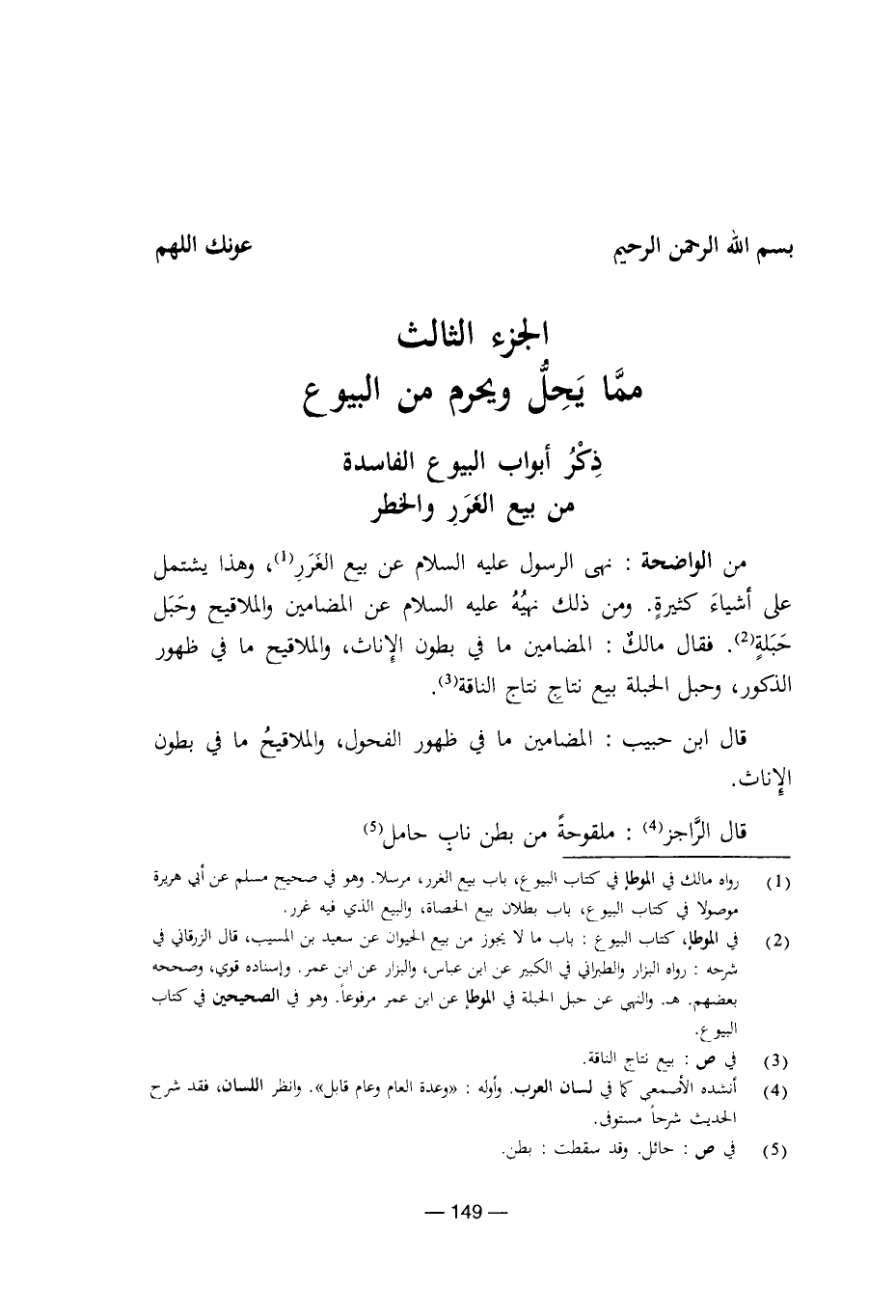 من الواضحة: نهى الرسول عليه السلام عن بيع الغرر، وهذا يشتمل على أشياء كثيرة. ومن ذلك نهيه عليه السلام عن المضامين والملاقيح وحبل حبلة. فقال مالك: المضامين ما في بطون الإناث، والملاقيح ما في ظهور الذكور، وحبل الحبلة بيع نتاج نتاج الناقة.