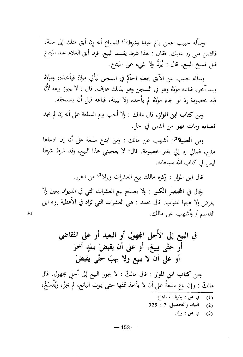 ومن كتاب ابن المواز: قال مالك: لا يجوز البيع إلى أجل مجهول. قال مالك: وإن باع سلعة على أن لا يأخذ ثمنها حتى يموت البائع، لم يجز، ويفسخ،