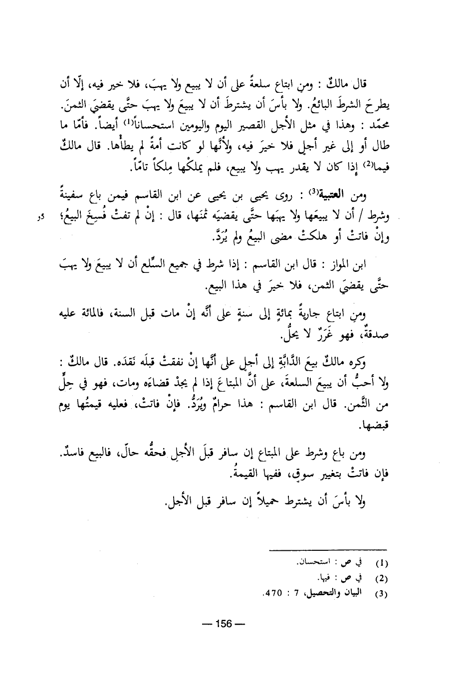 قال مالك: ومن ابتاع سلعة على أن لا يبيع ولا يهب، فلا خير فيه، إلا أن يطرح الشرط البائع. ولا بأس أن يشترط أن لا يبيع ولا يهب حتى يقضي الثمن. محمد: وهذا في مثل الأجل القصير اليوم واليومين استحسانًا أيضًا. فأما ما طال أو إلى غير أجل فلا خير فيه، ولأنها لو كانت أمة لم يطأها. قال مالك فيما إذا كان لا يقدر يهب ولا يبيع، فلم يملكها ملكًا تامًا.