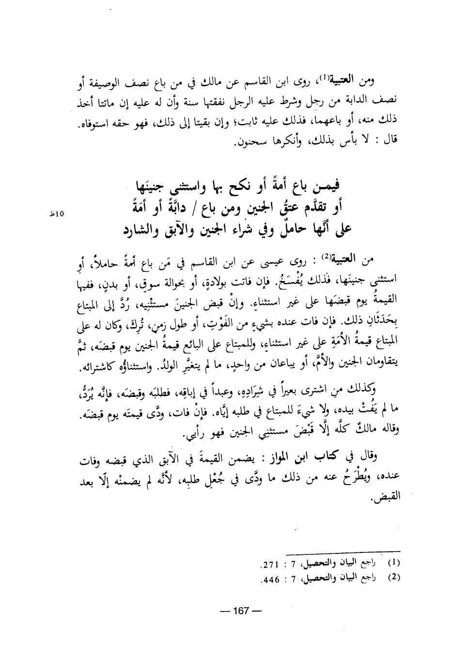 من العتبية: روى عيسى عن ابن القاسم في من باع أمة حاملاً، أو استثنى جنينها، فذلك يفسخ، فإن فاتت بولادة، أو بحوالة سوق، أو بدن، ففيها القيمة يوم قبضها على غير استثناء. وإن قبض الجنين مستثنيه، رد إلى المبتاع بحدثان ذلك، فإن فات عنده بشيء من الفوت، أو طول زمن، ترك، وكان له على المبتاع قيمة الأمة على غير استثناء، وللمبتاع على البائع قيمة الجنين يوم قبضه، ثم يتقاومان الجنين والأم، أو يباعان من واحد، ما لم يتغير الولد، واستثناؤه كاشترائه.