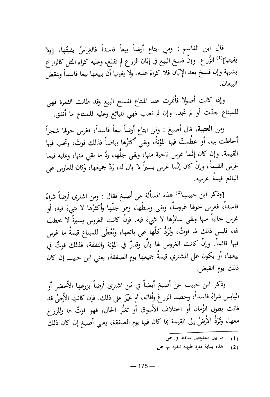وذكر ابن حبيب عن أصبغ أيضًا في من اشترى أرضًا يزرعها الأخضر أو اليابس شراء فاسدًا، وحصد الزرع وأفاته، ثم غير على ذلك، فإن كانت الأرض قد فاتت بطول الزمان أو اختلاف الأسواق أو تغير الحال، فهو فوت لها وللزرع معها، وترد الأرض إلى القيمة بما كان فيها يوم الصفقة، يعني أصبغ إن كان ذلك