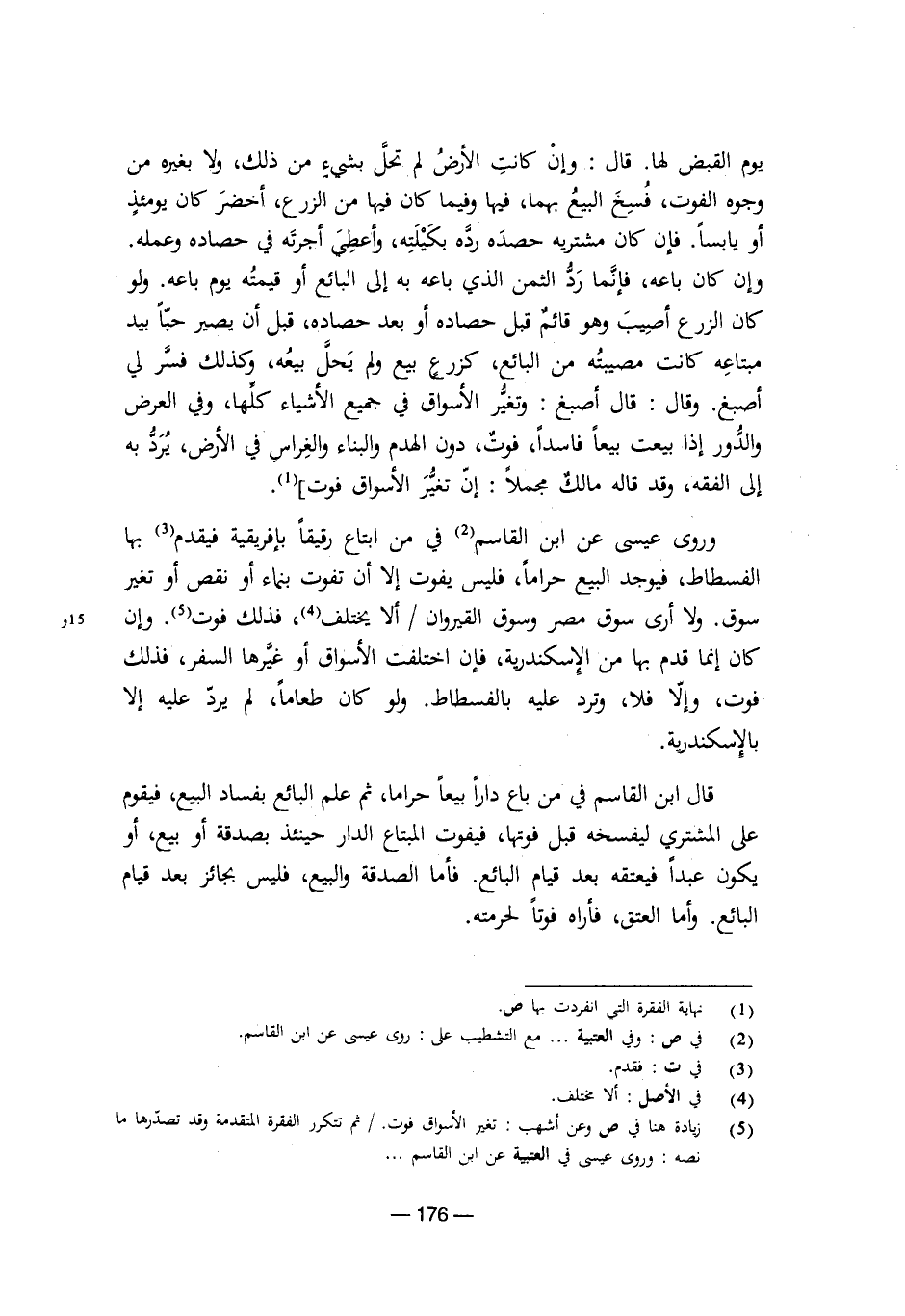 وروى عيسى عن ابن القاسم في من ابتاع رقيقًا بإفريقية فيقدم بها الفسطاط، فيوجد البيع حرامًا، فليس يفوت إلا أن تفوت بنماء أو نقص أو تغير سوق، ولا أرى سوق مصر وسوق القيروان ألا يختلف، فذلك فوت، وإن كان إنما قدم بها من الإسكندرية، فإن اختلفت الأسواق أو غيرها السفر، فذلك فوت، وإلا فلا، وترد عليه بالفسطاط، ولو كان طعامًا، لم يرد عليه إلا بالإسكندرية.