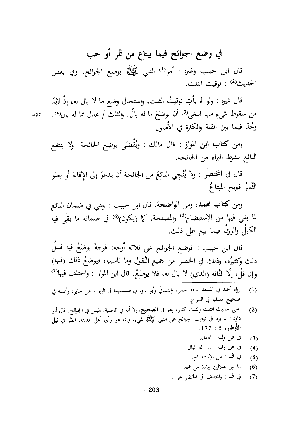 قال ابن حبيب وغيره: أمر النبي صلى الله عليه وسلم بوضع الجوائح. وفي بعض الحديث: توقيت الثلث.