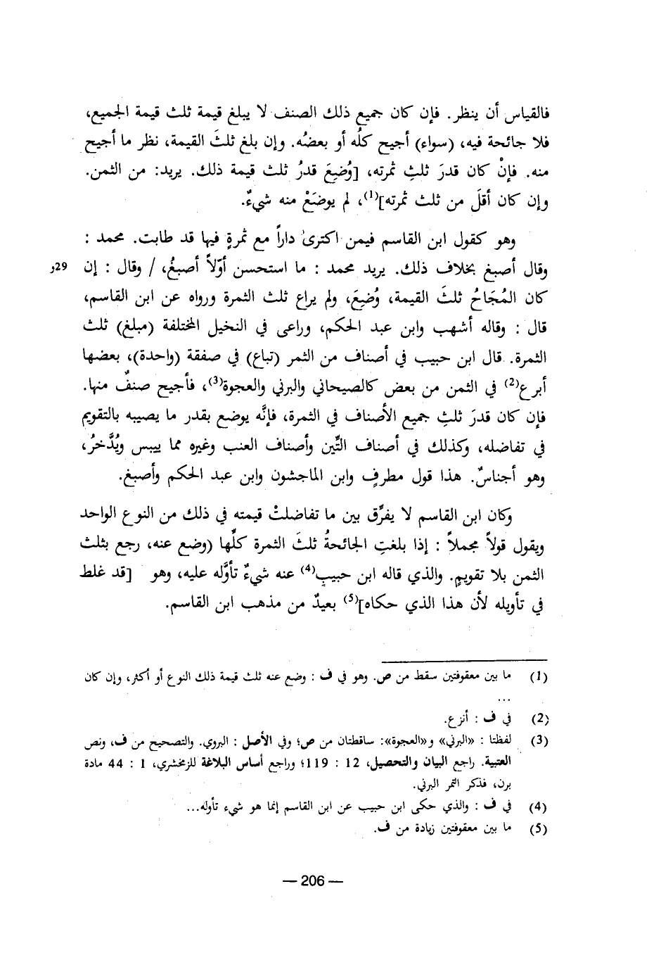 وكان ابن القاسم لا يفرق بين ما تفاضلت قيمته في ذلك من النوع الواحد ويقول قولاً مجملاً: إذا بلغت الجائحة ثلث الثمرة كلها وضع عنه، رجع بثلث الثمن بلا تقويم، والذي قاله ابن حبيب عنه شيء تأوله عليه، وهو قد غلط في تأويله لأن هذا الذي حكاه بعيد من مذهب ابن القاسم.