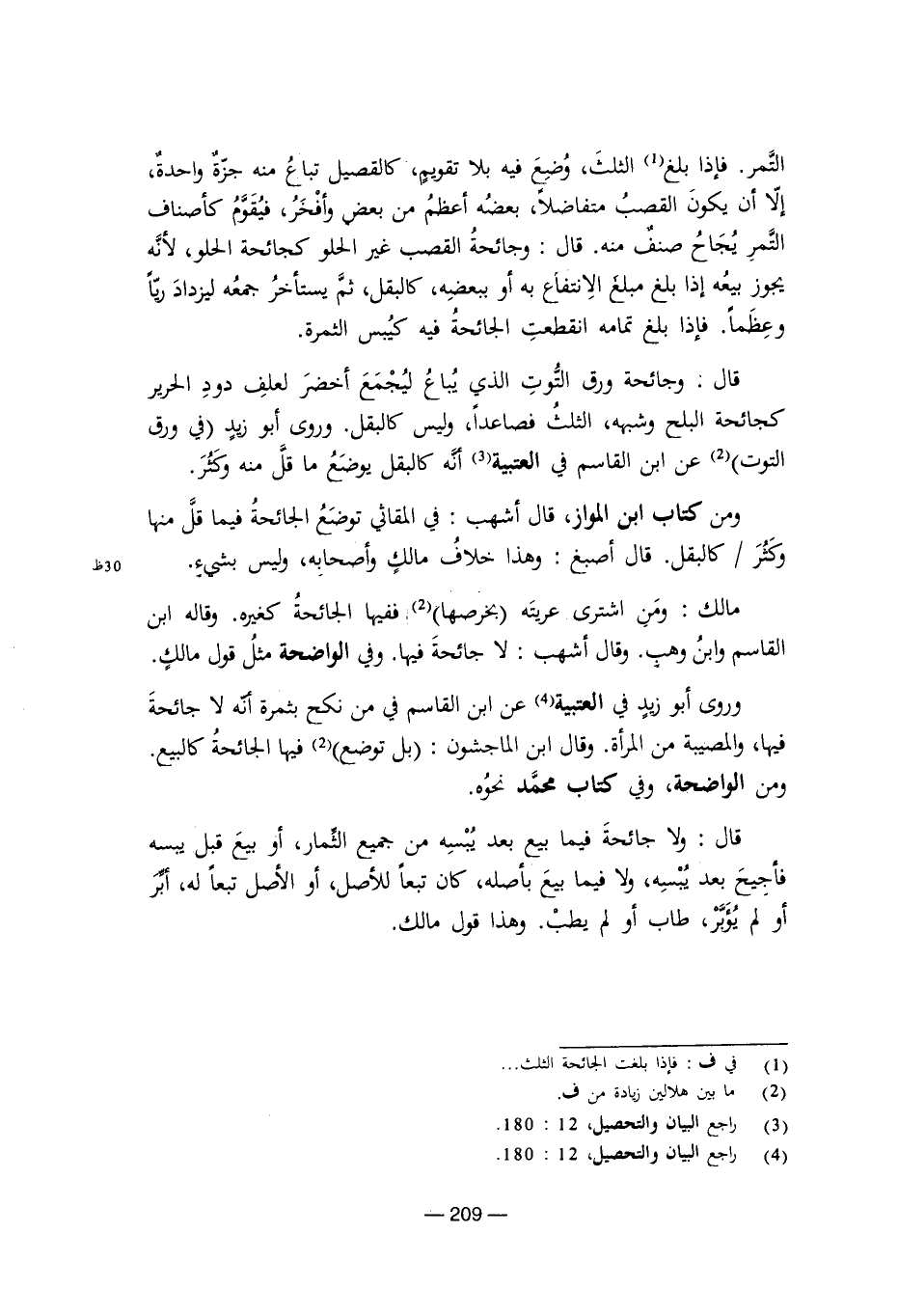 قال: وجائحة ورق التوت الذي يباع ليجمع أخضر لعلف دود الحرير كجائحة البلح وشبهه، الثلث فصاعدًا، وليس كالبقل. وروى أبو زيد في ورق التوت عن ابن القاسم في العتبية أنه كالبقل يوضع ما قل منه وكثر.