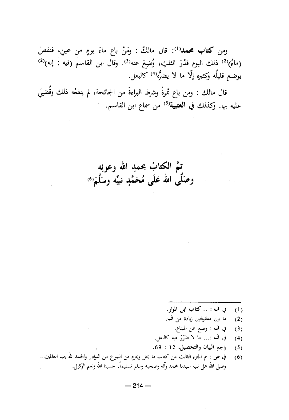 ومن كتاب محمد: قال مالك: ومن باع ماء يوم من عين، فنقص ماء ذلك اليوم ثدر الثلث، وضع عنه. وقال ابن القاسم فيه: إنه يوضع قليله وكثيره إلا ما لا يضره كالبعل.