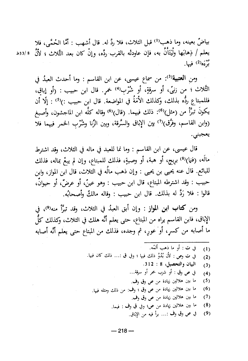 ومن العتبية: من سماع عيسى، عن ابن القاسم: وما أحدث العبد في الثلاث، من زنى، أو سرقة، أو شرب خمر. قال ابن حبيب: أو إباق، فللمبتاع رده بذلك، وكذلك الأمة في المواضعة. قال ابن حبيب: إلا أن يكون تبرأ من مثل ذلك فيهما. قال: وقاله كله ابن الماجشون، وأصبغ وابن القاسم، وفرق بين الإباق والسرقة، وبين الزنا وشرب الخمر فيهما فلا يعجبني.