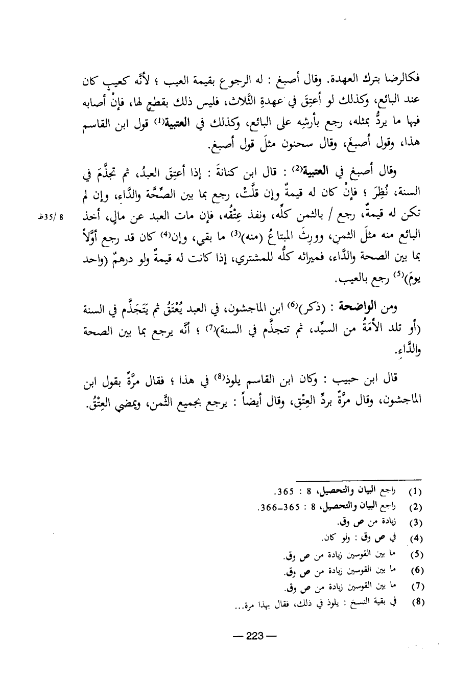 ومن الواضحة: ذكر ابن الماجشون في العبد يعتق ثم يتجذم في السنة أو تلد الأمة من السيد، ثم تتجذم في السنة، أنه يرجع بما بين الصحة والداء.