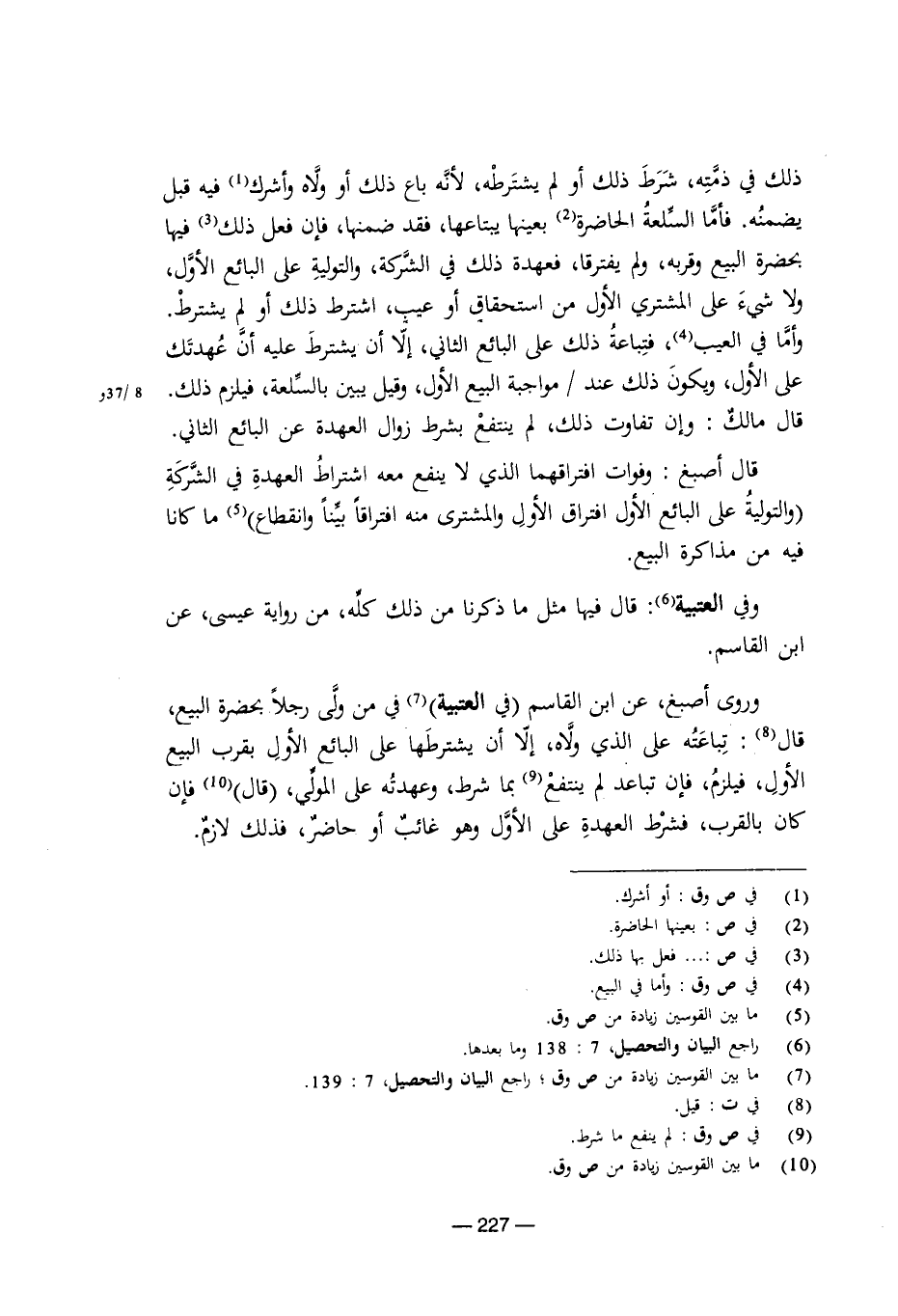 ذلك في ذمته، شرط ذلك أو لم يشترطه؛ لأنه باع ذلك أو ولاه وأشرك فيه قبل يضمنه. فأما السلعة الحاضرة بعينها يبتاعها، فقد ضمنها، فإن فعل ذلك فيها بحضرة البيع وقربه، ولم يفترقا، فعهدة ذلك في الشركة، والتولية على البائع الأول، ولا شيء على المشتري الأول من استحقاق أو عيب، اشترط ذلك أو لم يشترط. وأما في العيب، فتباعة ذلك على البائع الثاني، إلا أن يشترط عليه أن عهدتك على الأول، ويكون ذلك عند مواجبة البيع الأول، وقيل يبين بالسلعة، فيلزم ذلك. قال مالك: وإن تفاوت ذلك، لم ينتفع بشرط زوال العهدة عن البائع الثاني.