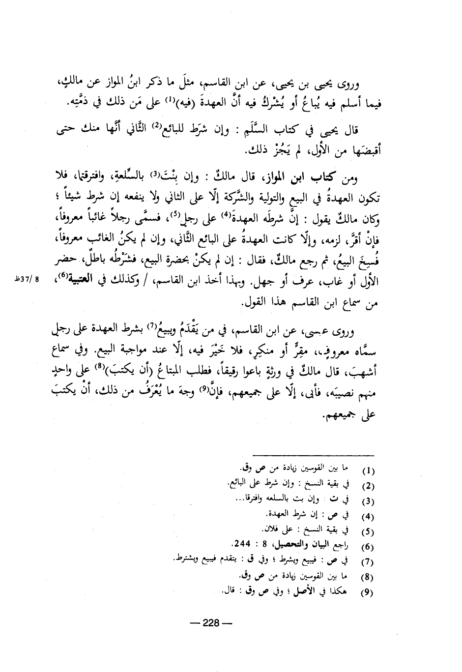 وروى يحيى بن يحيى، عن ابن القاسم، مثل ما ذكر ابن المواز عن مالك، فيما أسلم فيه يباع أو يشرك فيه أن العهدة فيه على من ذلك في ذمته.