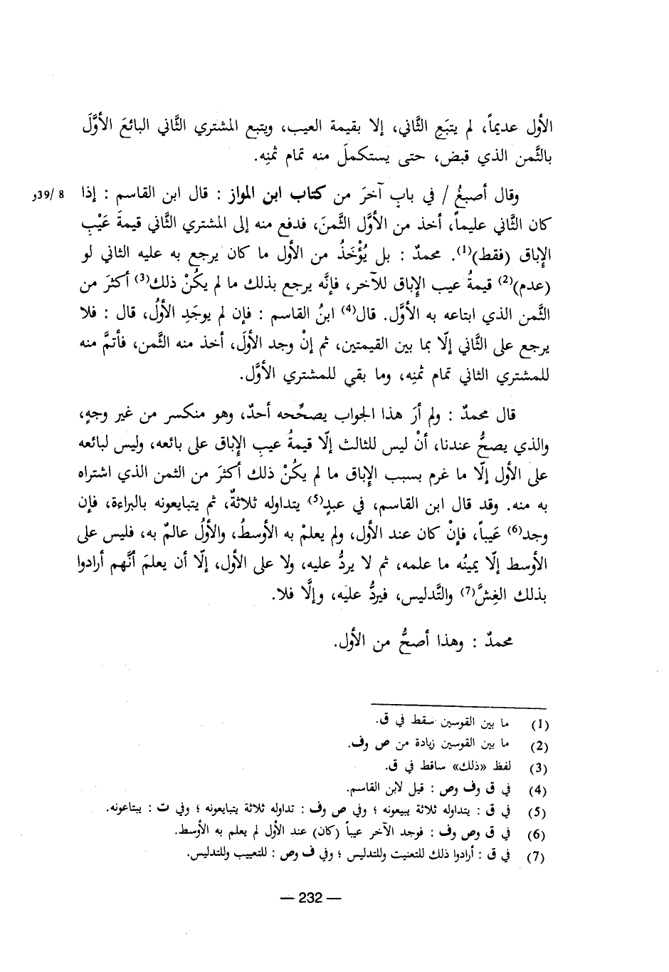 وقال أصبغ في باب آخر من كتاب ابن المواز: قال ابن القاسم: إذا كان الثاني عليمًا، أخذ من الأول الثمن، فدفع منه إلى المشتري الثاني قيمة عيب الإباق فقط. محمد: بل يؤخذ من الأول ما كان يرجع به عليه الثاني لو عدم قيمة عيب الإباق للآخر، فإنه يرجع بذلك ما لم يكن ذلك أكثر من الثمن الذي ابتاعه به الأول. قال ابن القاسم: فإن لم يوجد الأول، قال: فلا يرجع على الثاني إلا بما بين القيمتين، ثم إن وجد الأول، أخذ منه الثمن، فأتم منه للمشتري الثاني تمام ثمنه، وما بقي للمشتري الأول.