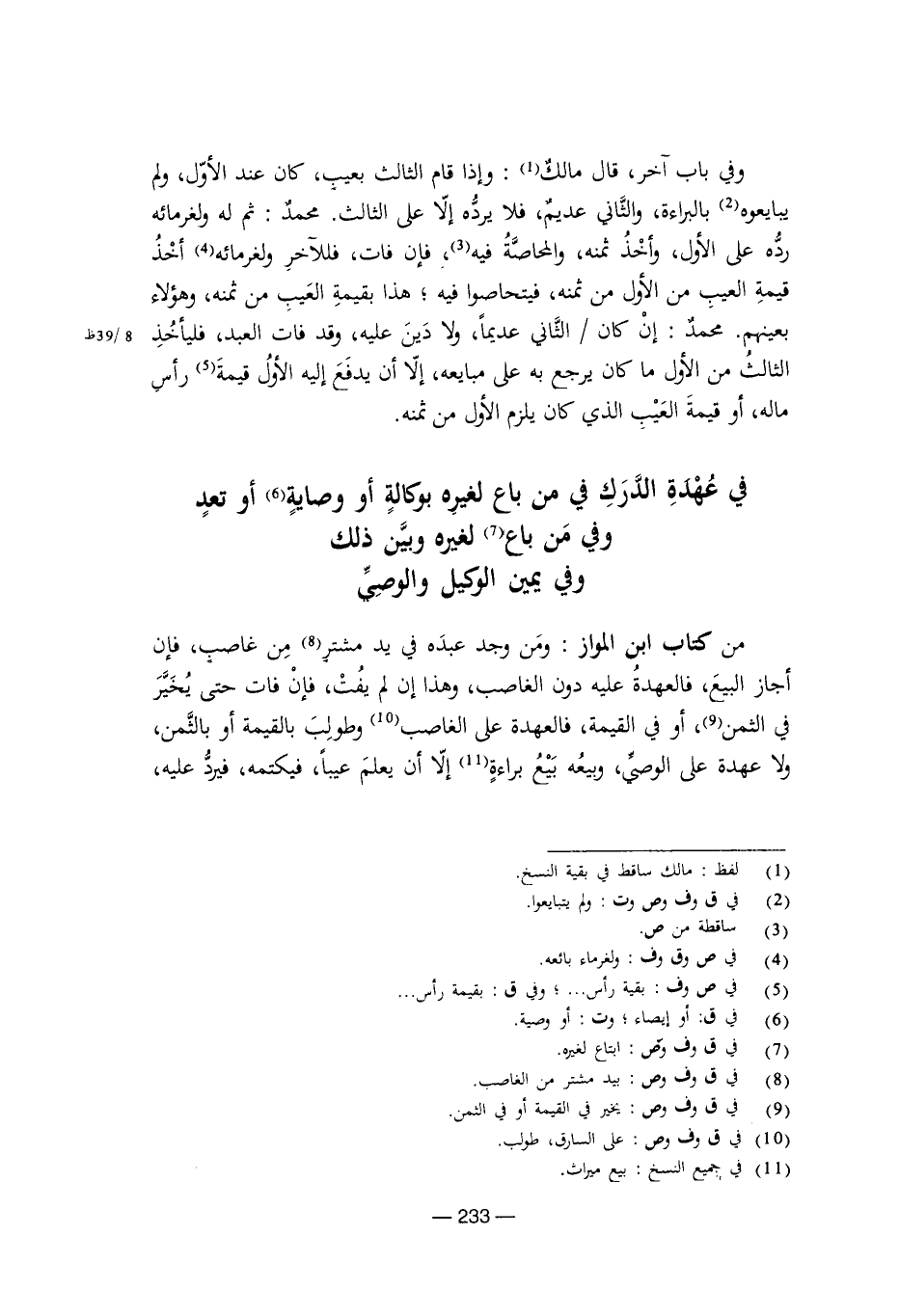 وفي باب آخر، قال مالك: وإذا قام الثالث بعيب، كان عند الأول، ولم يبايعوه بالبراءة، والثاني عديم، فلا يرده إلا على الثالث. محمد: ثم له ولغرمائه رده على الأول، وأخذ ثمنه، والمحاصة فيه، فإن فات، فللآخر ولغرمائه أخذ قيمة العيب من الأول من ثمنه، فيتحاصوا فيه، هذا بقيمة العيب من ثمنه، وهؤلاء بعينهم. محمد: إن كان الثاني عديمًا، ولا دين عليه، وقد فات العبد، فليأخذ الثالث من الأول ما كان يرجع به على مبايعه، إلا أن يدفع إليه الأول قيمة راس ماله، أو قيمة الغيب الذي كان يلزم الأول من ثمنه.