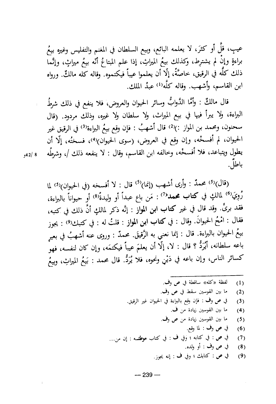 قال محمد: وأرى أشهب إنما قال: لا أفسخه في الحيوان لما روي لمالك في كتاب محمد: من باع عبدًا أو وليدة أو حيوانًا بالبراءة، فقد برئ. وقد قال في غير كتاب ابن المواز: إنه ذكر لمالك أن ذلك في كتبه، فقال: امح الحيوان. وقال في كتاب ابن المواز: قلت له: في كتبك: يجوز بيع الحيوان بالبراءة، قال: إنما نعني به الرقيق. محمد: وروى عنه أشهب في بعير باعه سلطانه، أيرد؟ قال: لا، إلا أن يعلم عيبًا فيكتمه، وإن كان لنفسه، فهو كسائر الناس، وإن باعه في دين ونحوه، فلا يرد. قال محمد: بيع الميراث، وبيع