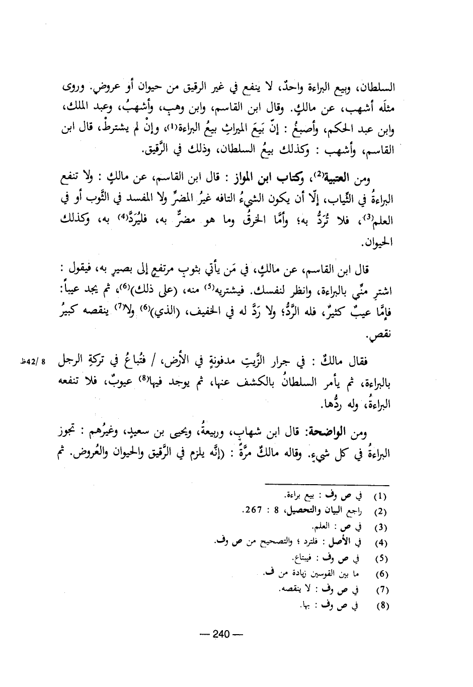 ومن الواضحة: قال ابن شهاب، وربيعة، ويحيى بن سعيد، وغيرهم: تجوز البراءة في كل شيء. وقاله مالك مرة: إنه يلزم في الرقيق والحيوان والعروض. ثم