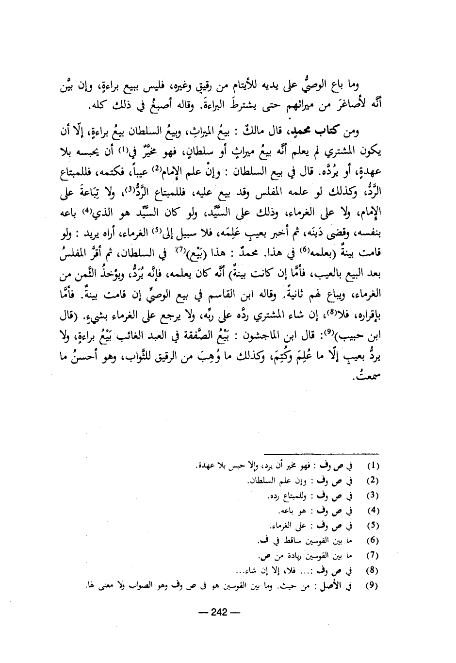 ومن كتاب محمد، قال مالك: بيع الميراث، وبيع السلطان بيع براءة، إلا أن يكون المشتري لم يعلم أنه بيع ميراث أو سلطان، فهو مخير في أن يحبسه بلا عهدة أو يرده. قال في بيع السلطان: وإن علم الإمام عيبًا، فكتمه، فللمبتاع الرد، وكذلك لو علمه المفلس وقد بيع عليه، فللمبتاع الرد، ولا تباعة على الإمام، ولا على الغرماء، وذلك على السيد، ولو كان السيد هو الذي باعه بنفسه، وقضى دينه، ثم أخبر بعيب علمه، فلا سبيل إلى الغرماء، أراه يريد: ولو قامت بينة بعلمه في هذا. محمد: هذا بيع في السلطان، ثم أقر المفلس بعد البيع بالعيب، فأما إن كانت بينة أنه كان يعلمه، فإنه يرد، ويؤخذ الثمن من الغرماء، ويباع لهم ثانية. وقاله ابن القاسم في بيع الوصي إن قامت بينة. فأما بإقراره، فلا، إن شاء المشتري رده على ربه، ولا يرجع على الغرماء بشيء. قال ابن حبيب: قال ابن الماجشون: بيع الصفقة في العبد الغائب بيع براءة، ولا يرد بعيب إلا ما علم وكتم، وكذلك ما وهب من الرقيق للثواب، وهو أحسن ما سمعت.