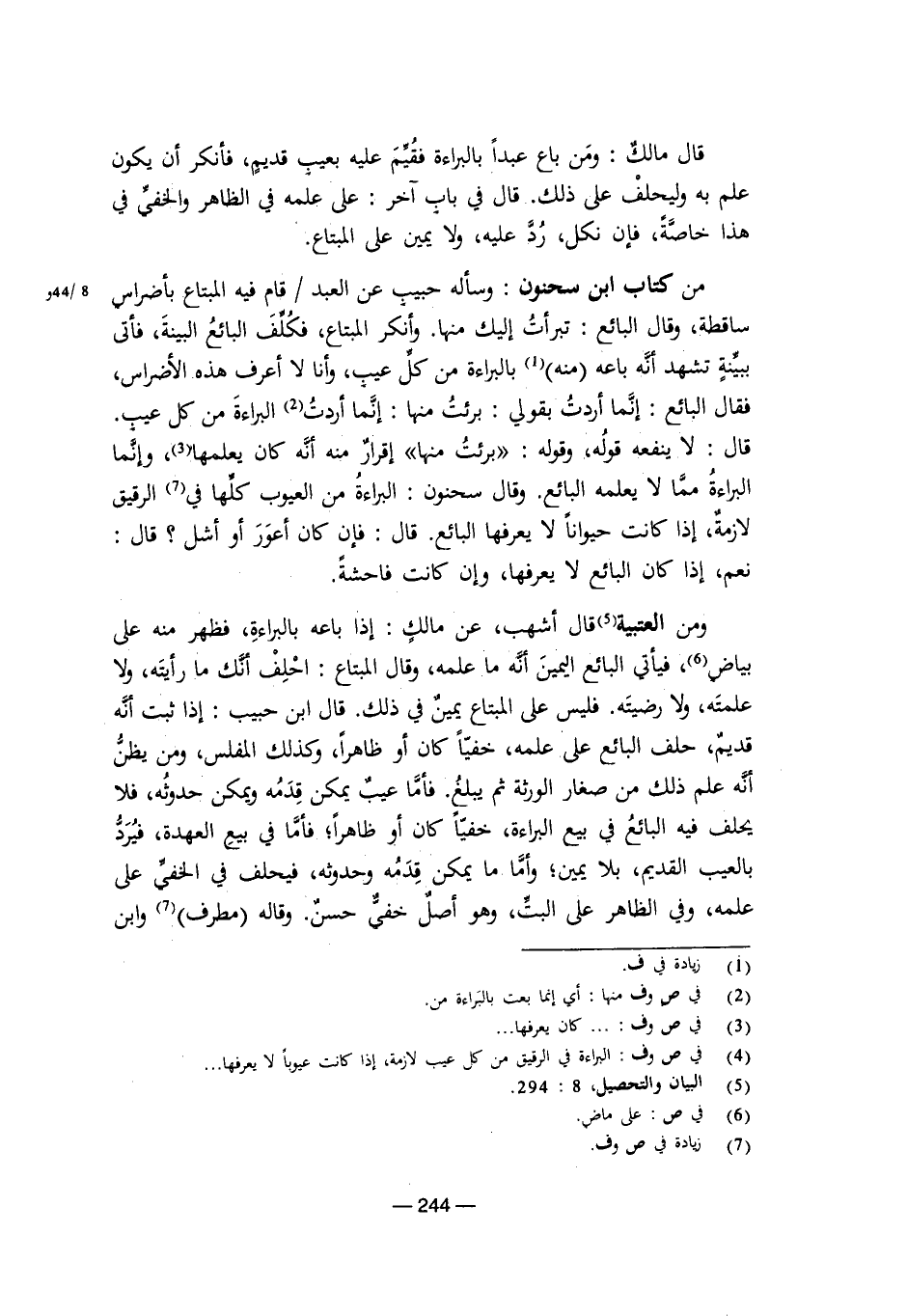 ومن العتبية قال أشهب، عن مالك: إذا باعه بالبراءة، فظهر منه على بياض، فيأتي البائع اليمين أنه ما علمه، وقال المبتاع: احلف أنك ما رأيته، ولا علمته، ولا رضيته، فليس على المبتاع يمين في ذلك. قال ابن حبيب: إذا ثبت أنه قديم، حلف البائع على علمه، خفيًا كان أو ظاهرًا، وكذلك المفلس، ومن يظن أنه علم ذلك من صغار الورثة ثم يبلغ. فأما عيب يمكن قدمه ويمكن حدوثه، فلا يحلف فيه البائع في بيع البراءة، خفيًا كان أو ظاهرًا، فأما في بيع العهدة، فيرد بالعيب القديم، بلا يمين، وأما ما يمكن قدمه وحدوثه، فيحلف في الخفي على علمه، وفي الظاهر على البت، وهو أصل خفي حسن. وقاله مطرف وابن
