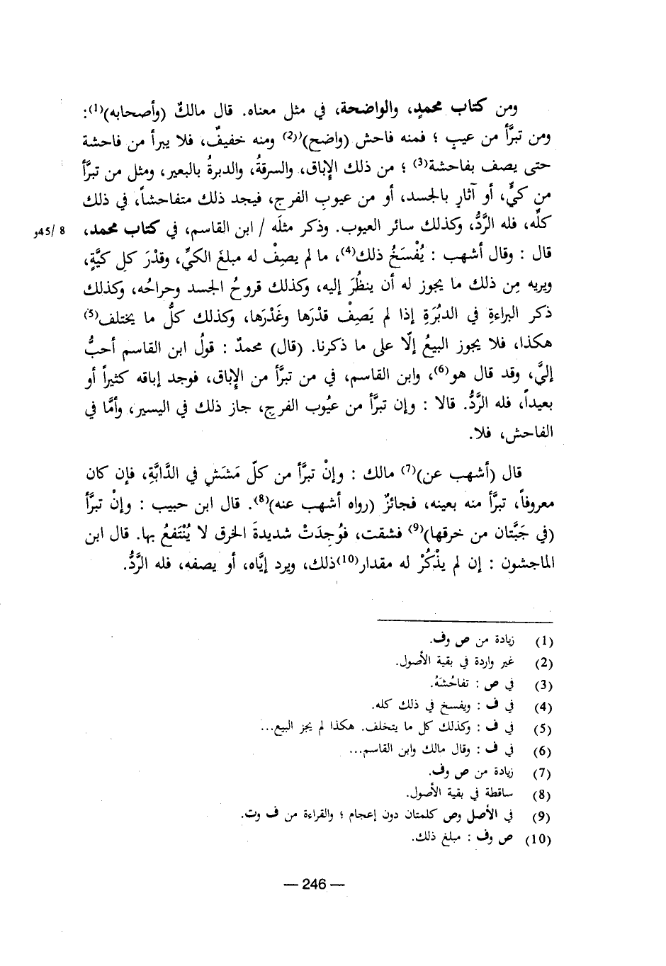 ومن كتاب محمد، والواضحة، في مقل معناه. قال مالك وأصحابه: ومن تبرأ من عيب، فمنه فاحش واضح ومنه خفيف، فلا يبرأ من فاحشة حتى يصف بفاحشة، من ذلك الإباق، والسرقة، والدبرة بالبعير، ومثل من تبرأ من كي، أو آثار بالجسد، أو من عيوب الفرج، فيجد ذلك متفاحشًا، في ذلك كله، فله الرد، وكذلك سائر العيوب. وذكر مثله ابن القاسم في كتاب محمد، قال: وقال أشهب: يفسخ ذلك، ما لم يصف له مبلغ الكي، وقدر كل كية، ويريه من ذلك ما يجوز له أن ينظر إليه، وكذلك قروح الجسد وحراحه، وكذلك ذكر البراءة في الدبرة إذا لم يصف قدرها وغدرها، وكذلك كل ما يختلف هكذا، فلا يجوز البيع إلا على ما ذكرنا. قال محمد: قول ابن القاسم أحب إلي، وقد قال هو، وابن القاسم، في من تبرأ من الإباق، فوجد إباقه كثيرًا أو بعيدًا، فله الرد، قالا: وإن تبرأ من عيوب الفرج، جاز ذلك في اليسير، وأما في الفاحش، فلا.