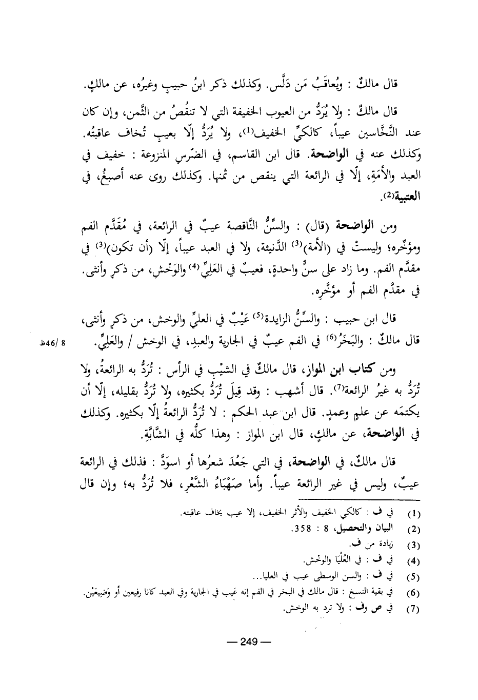 ومن الواضحة قال: والسن الناقصة عيب في الرائعة، في مقدم الفم ومؤخره، وليست في الأمة الدنيئة، ولا في العبد عيبًا، إلا أن تكون في مقدم الفم. وما زاد على سن واحدة، فعيب في العلي والوخش، من ذكر وأنثى. في مقدم الفم أو مؤخره.