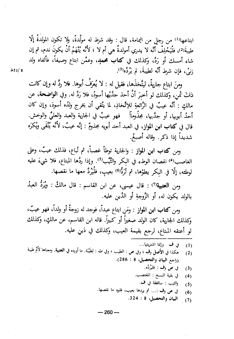 ابتاعها من رجل من اليمامة، قال: وقد شرط له مولدة، ولا تكون المولدة إلا طيبة، فليحلف أنه لا يدري هي أم لا؛ لأنه يتهم أن يكون ندم، ثم إن شاء أمسك أو رد، وكذلك في كتاب محمد، وعمن ابتاع وصيفًا، فألفاه ولد زنى، فإن شرط أنه لطيبة، لم يرده.