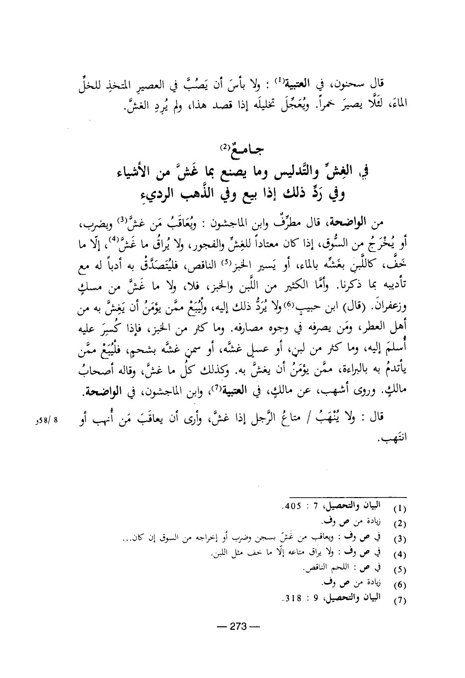 من الواضحة، قال مطرف وابن الماجشون: ويعاقب من غش ويضرب، أو يخرج من السوق، إذا كان معتادًا للغش والفجور، ولا يراق ما غش، إلا ما خف، كاللبن بغشه بالماء، أو يسير الخبز الناقص، فليتصدق به أدبًا له مع تأديبه بما ذكرنا. وأما الكثير من اللبن والخبز، فلا، ولا ما غش من مسك وزعفران. قال ابن حبيب: ولا يرد ذلك إليه، وليبع ممن يؤمن أن يغش به من أهل العطر، ومن يصرفه في وجوه مصارفه. وما كثر من الخبز، فإذا كسر عليه أسلم إليه، وما كثر من لبن، أو عسل غشه، أو سمن غشه بشحم، فليبع ممن يأتدم به بالبراءة، ممن يؤمن أن يغش به. وكذلك كل ما غش، وقاله أصحاب مالك. وروى أشهب، عن مالك، في العتبية، وابن الماجشون في الواضحة.