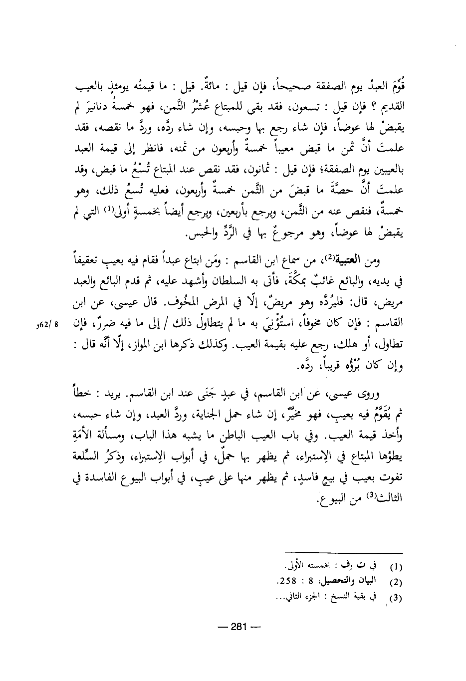 ومن العتبية، من سماع ابن القاسم: ومن ابتاع عبدًا فقام فيه بعيب تعقيفًا في يديه، والبائع غائب بمكة، فأتى به السلطان وأشهد عليه، ثم قدم البائع والعبد مريض، قال: فليرد وهو مريض، إلا في المرض المخوف. قال عيسى، عن ابن القاسم: فإن كان مخوفًا، استؤني به ما لم يتطاول ذلك إلى ما فيه ضرر، فإن تطاول، أو هلك، رجع عليه بقيمة العيب. وكذلك ذكرها ابن المواز، إلا أنه قال: وإن كان برؤه قريبًا، رده.