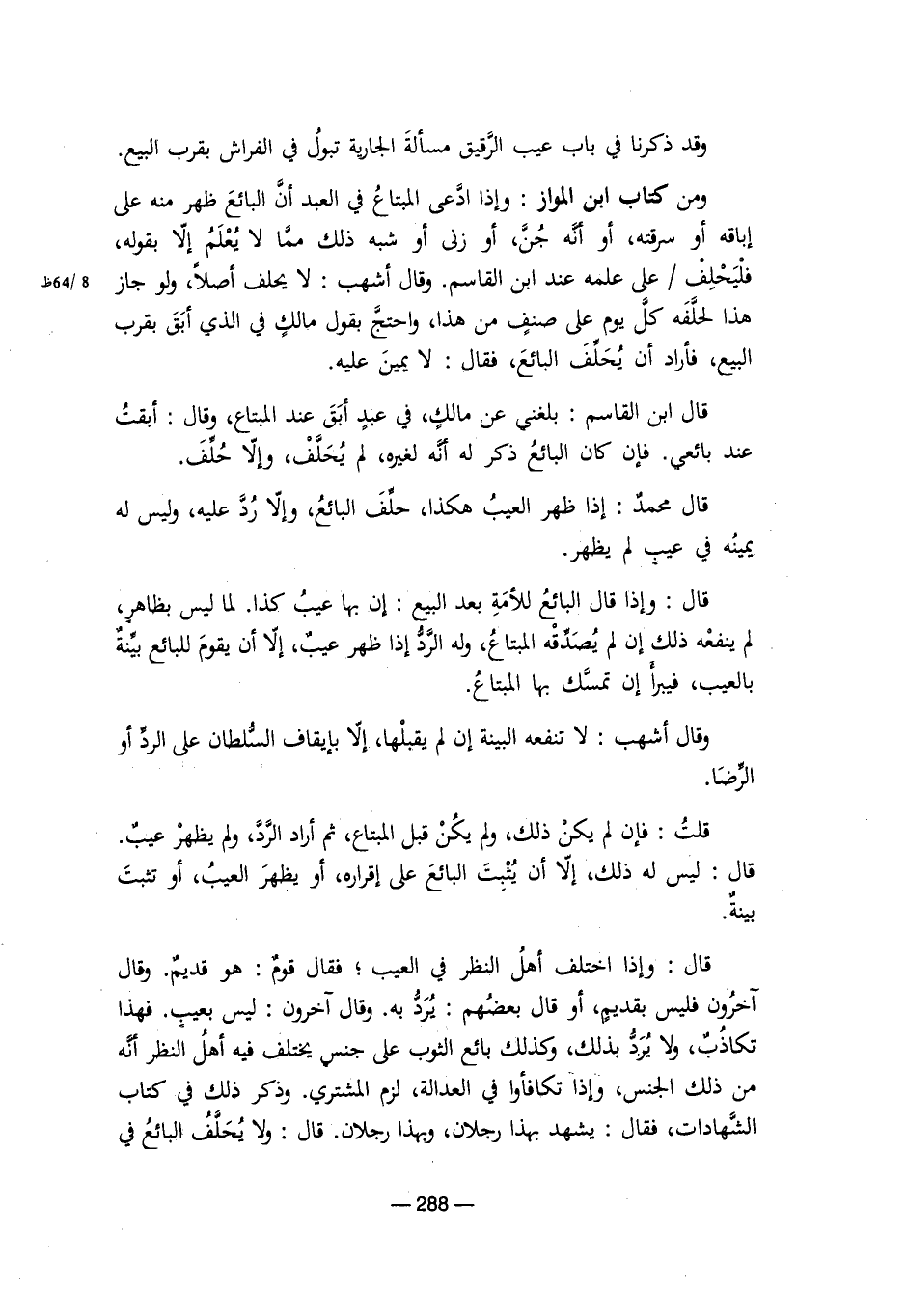 ومن كتاب ابن المواز: وإذا ادعى المبتاع في العبد أن البائع ظهر منه على إباقه أو سرقته، أو أنه جن، أو زنى أو شبه ذلك مما لا يعلم إلا بقوله، فليحلف على علمه عند ابن القاسم. وقال أشهب: لا يحلف أصلاً، ولو جاز هذا لحلفه كل يوم على صنف من هذا، واحتج بقول مالك في الذي أبق بقرب البيع، فأراد أن يحلف البائع، فقال: لا يمين عليه.