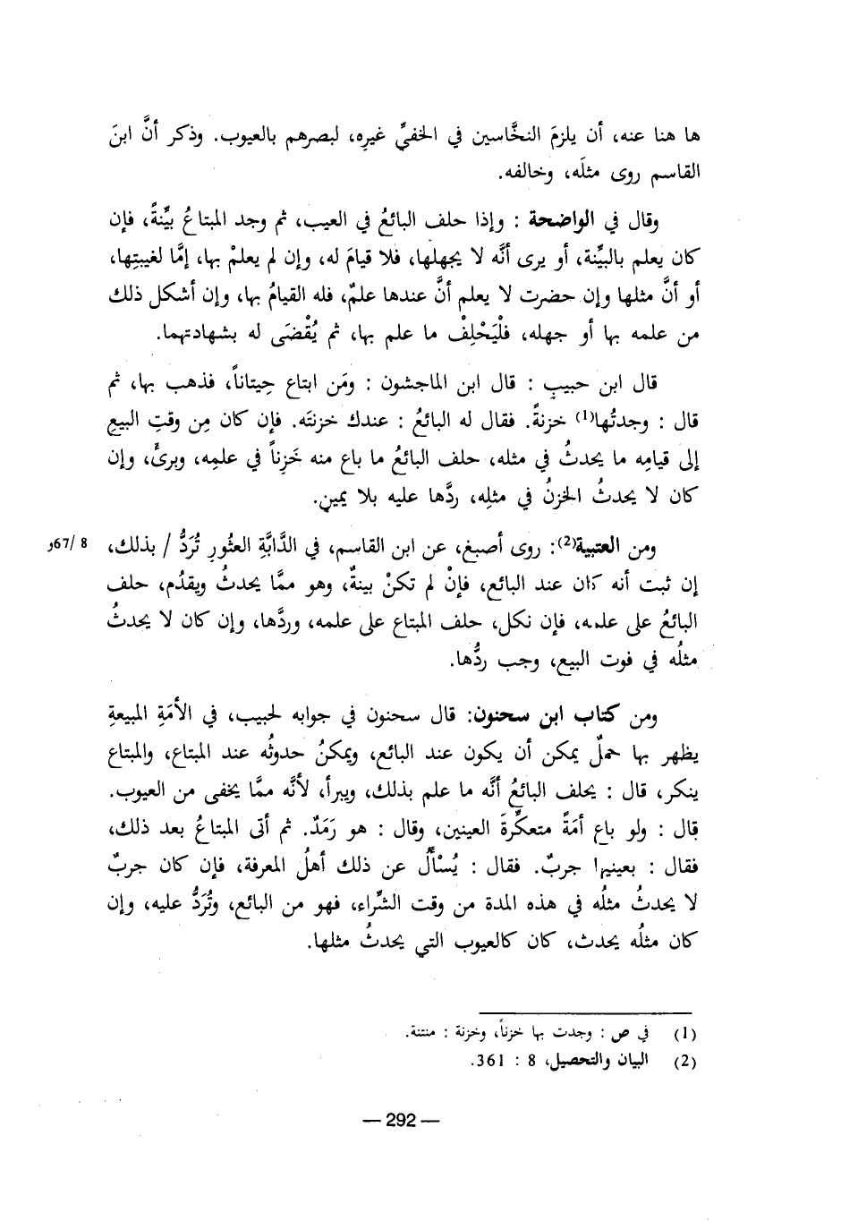 قال ابن حبيب: قال ابن الماجشون: ومن ابتاع حيتانًا، فذهب بها، ثم قال: وجدتها خزنة، فقال له البائع: عندك خزنته، فإن كان من وقت البيع إلى قيامه ما يحدث في مثله، حلف البائع ما باع منه خزنًا في علمه، وبرئ، وإن كان لا يحدث الخزن في مثله، ردها عليه بلا يمين.
