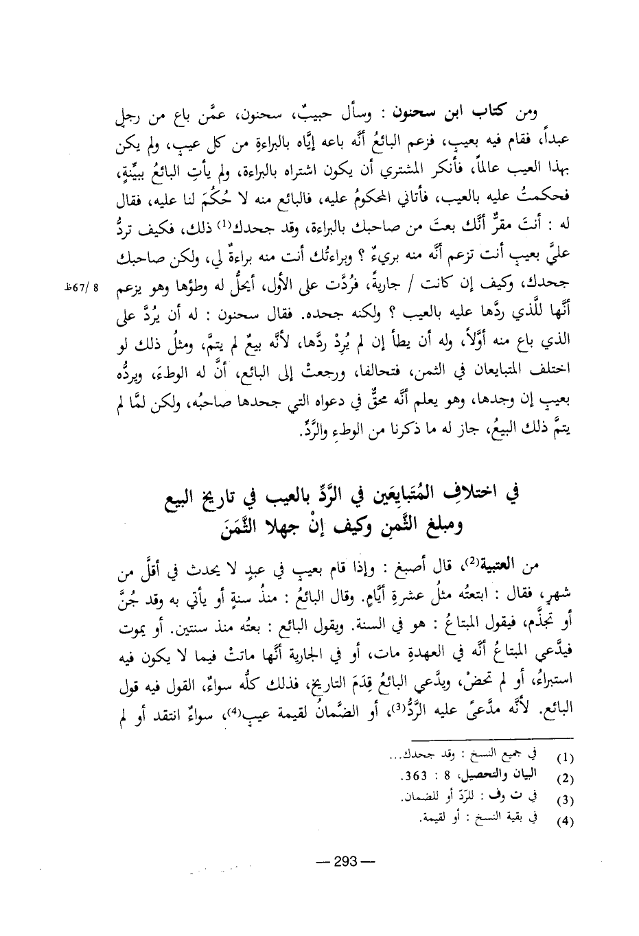 ومن كتاب ابن سحنون: وسأل حبيب سحنون عمن باع من رجل عبدًا، فقام فيه بعيب، فزعم البائع أنه باعه إياه بالبراءة من كل عيب، ولم يكن بهذا العيب عالمًا، فأنكر المشتري أن يكون اشتراه بالبراءة، ولم يأت البائع ببينة، فحكمت عليه بالعيب، فأتاني المحكوم عليه، فالبائع منه لا حكم لنا عليه، فقال له: أنت مقر أنك بعت من صاحبك بالبراءة، وقد جحدك ذلك، فكيف ترد علي بعيب أنت تزعم أنه منه بريء؟ وبراءتك أنت منه براءة لي، ولكن صاحبك جحدك، وكيف إن كانت جارية، فردت على الأول، أيحل له وطؤها وهو يزعم أنها للذي ردها عليه بالعيب؟ ولكن يجحده. فقال سحنون: له أن يرد على الذي باع منه أولاً، وله أن يطأ إن لم يرد ردها؛ لأنه بيع لم يتم، ومثل ذلك لو اختلف المتبايعان في الثمن، فتحالفا، ورجعت إلى البائع، أن له الوطء، ويرده بعيب إن وجدها، وهو يعلم أنه محق في دعواه التي جحدها صاحبه، ولكن لما لم يتم ذلك البيع، جاز له ما ذكرنا من الوطء والرد.
