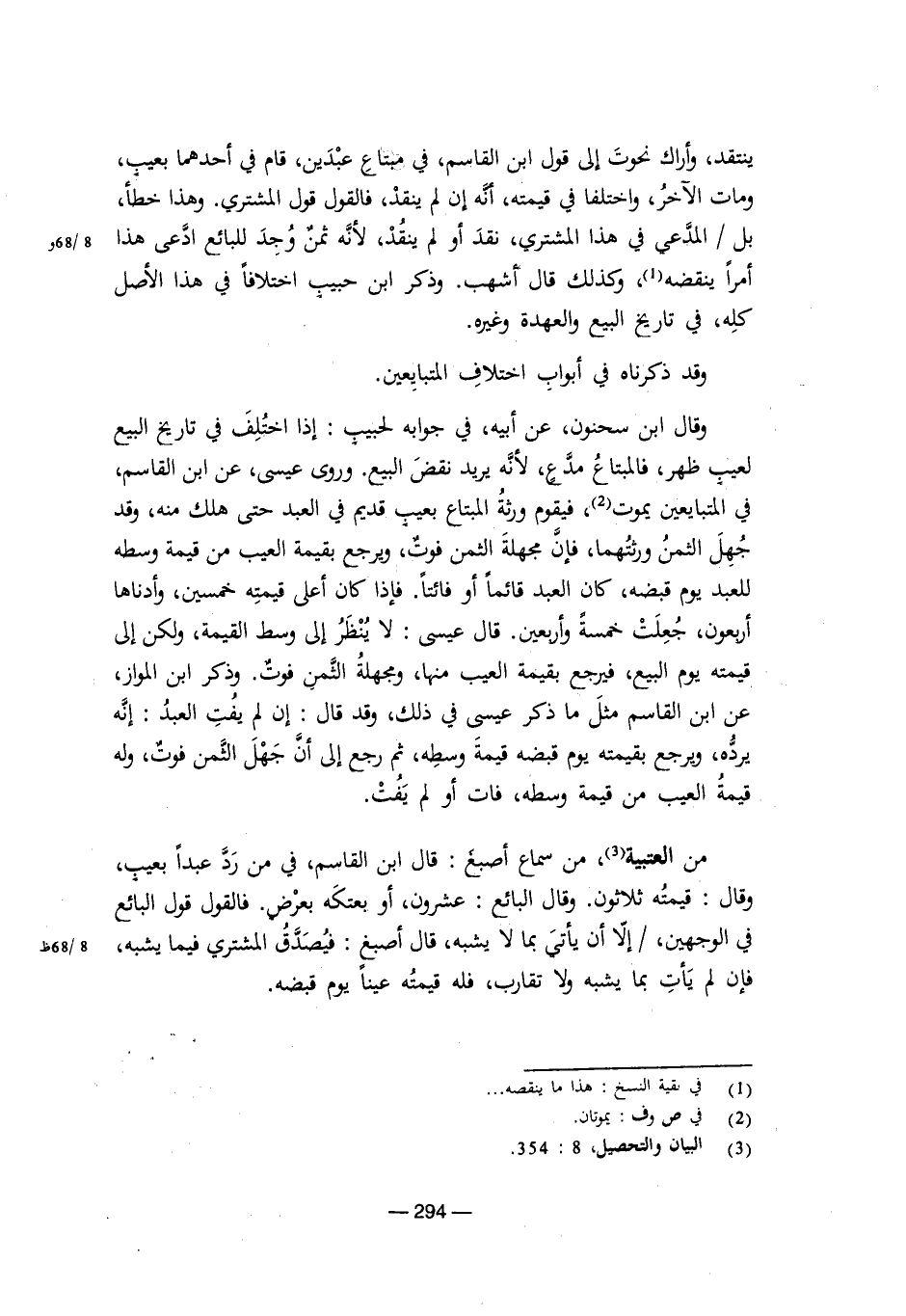 وقال ابن سحنون، عن أبيه، في جوابه لحبيب: إذا اختلف في تاريخ البيع لعيب ظهر، فالمبتاع مدع؛ لأنه يريد نقض البيع. وروى عيسى، عن ابن القاسم في المتبايعين يموت، فيقوم ورثة المبتاع بعيب قديم في العبد حتى هلك منه، وقد جهل الثمن ورثتهما، فإن مجهلة الثمن فوت، ويرجع بقيمة العيب من قيمة وسطه للعبد يوم قبضه، كان العبد قائمًا أو فائتًا. فإذا كان أعلى قيمته خمسين، وأدناها أربعون، جعلت خمسة وأربعين. قال عيسى: لا ينظر إلى وسقط القيمة، ولكن إلى قيمته يوم البيع، فيرجع بقيمة العيب منها، ومجهلة الثمن فوت. وذكر ابن المواز، عن ابن القاسم مثل ما ذكر عيسى في ذلك، وقد قال: إن لم يفت العبد: إنه يرده، ويرجع بقيمته يوم قبضه قيمة وسطه، ثم رجع إلى أن جهل الثمن فوت، وله قيمة العيب من قيمة وسطه، فات أو لم يفت.