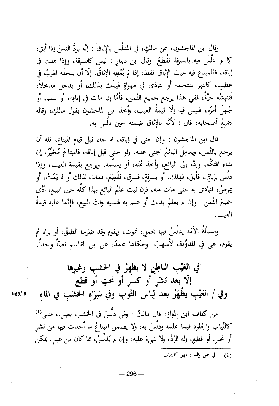 ومسألة الأمة يدلس فيها بحمل تموت، ويقوم وقد ضربها الطلق، أو يراه ثم يقوم، هي في المدونة لأشهب، وحكاها محمد عن ابن القاسم نصًا واحدًا.