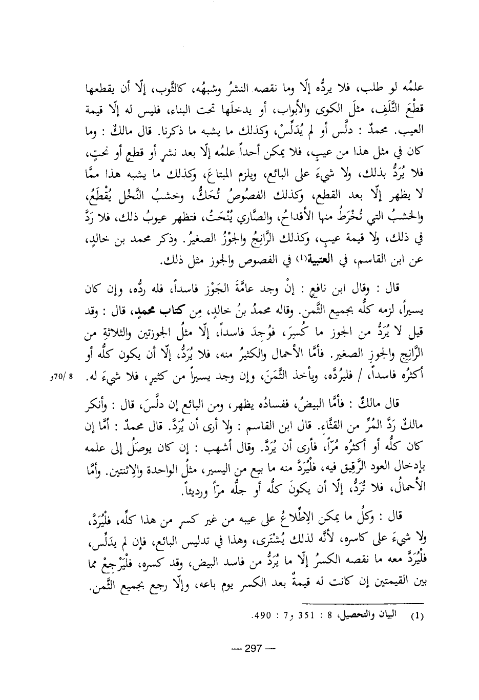 قال: وقال ابن نافع: إن وجد عامة الجوز فاسدًا، فله رده، وإن كان يسيرًا لزمه كله بجميع الثمن. وقاله محمد بن خالد، من كتاب محمد، قال: وقد قيل لا يرد من الجوز ما كسر، فوجد فاسدًا، إلا مثل الجوزتين والثلاثة من الرانج والجوز الصغير. فأما الأحمال والكثير منه، فلا يرد، إلا أن يكون كله أو أكثره فاسدًا، فليرده، ويأخذ الثمن، وإن وجد يسيرًا من كثير، فلا شيء له.