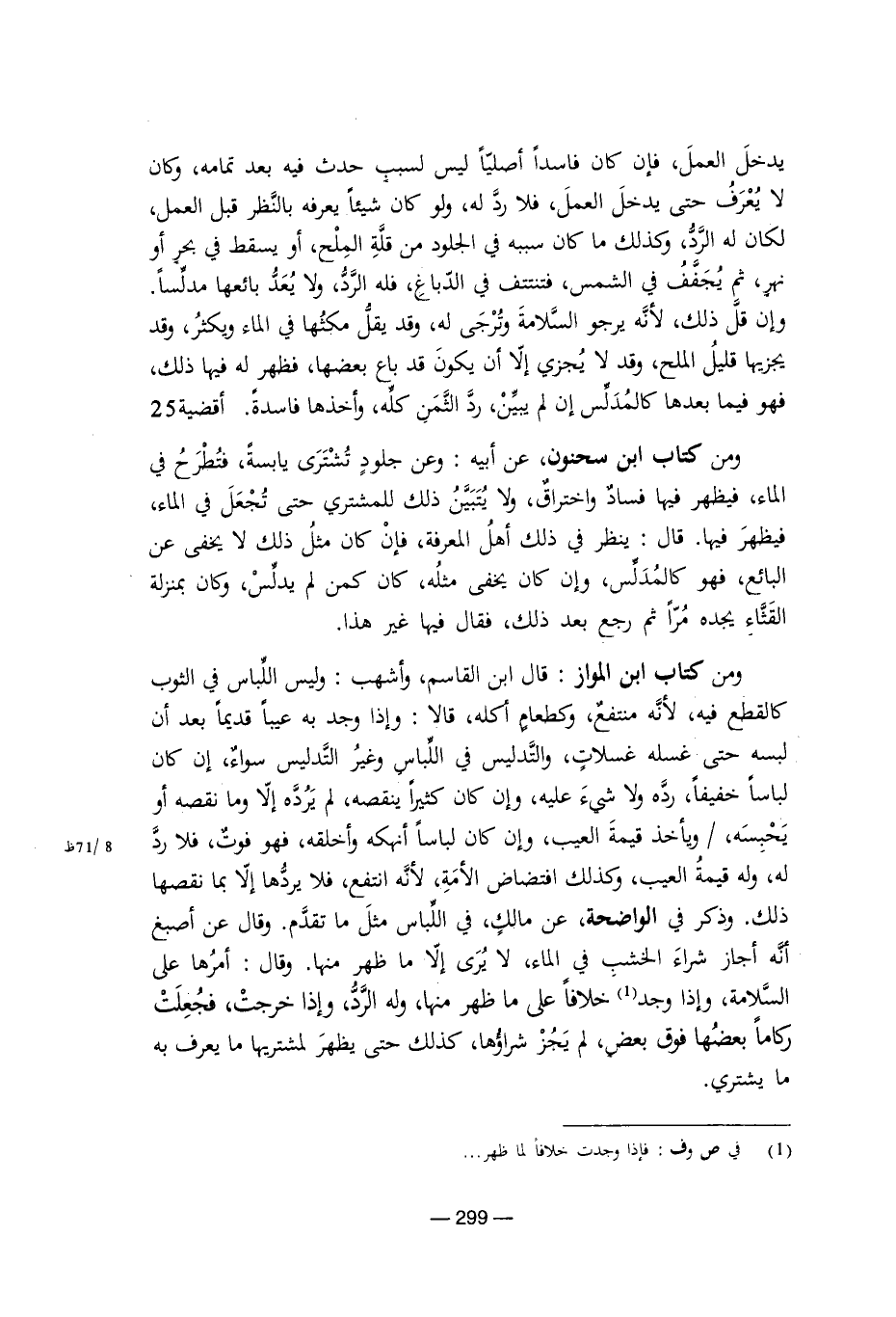 ومن كتاب ابن المواز: قال ابن القاسم وأشهب: وليس اللباس في الثوب كالقطع فيه؛ لأنه منتفع، وكطعام أكله، قالا: وإذا وجد به عيبًا قديمًا بعد أن لبسه حتى غسله غسلات، والتدليس في اللباس وغير التدليس سواء، إن كان لباسًا خفيفًا، رده ولا شيء عليه، وإن كان كثيرًا ينقصه، لم يرده إلا وما نقصه أو يحبسه، ويأخذ قيمة العيب، وكذلك افتضاض الأمة؛ لأنه انتفع، فلا يردها إلا بما نقصها ذلك. وذكر في الواضحة، عن مالك في اللباس مثل ما تقدم. وقال عن أصبغ أنه أجاز شراء الخشب في الماء، لا يرى إلا ما ظهر منها. وقال: أمرها على السلامة، وإذا وجد خلافًا على ما ظهر منها، وله الرد، وإذا خرجت، فجعلت ركامًا بعضها فوق بعض، لم يجز شراؤها، كذلك حتى يظهر لمشتريها ما يعرف به ما يشتري.