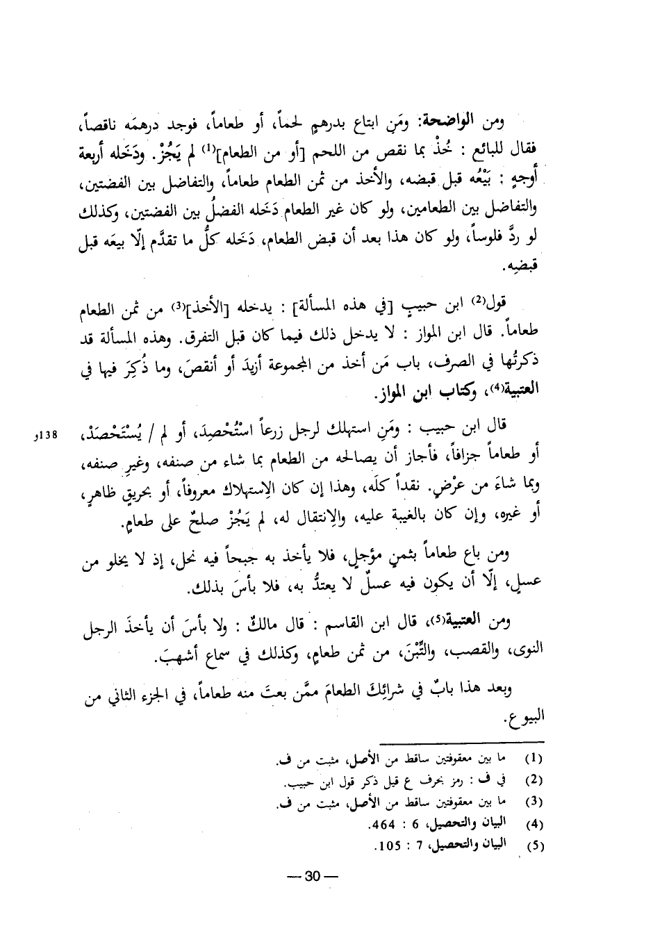 ومن الواضحة: ومن ابتاع بدرهم لحمًا، أو طعامًا، فوجد درهمه ناقصًا، فقال للبائع: خذ بما نقص من اللحم أو من الطعام لم يجز. ودخله أربعة أوجه: بيعه قبل قبضه، والأخذ من ثمن الطعام طعامًا، والتفاضل بين الفضتين، والتفاضل بين الطعامين، ولو كان غير الطعام دخله الفضل بين الفضتين، وكذلك لو رد فلوسًا، ولو كان هذا بعد أن قبض الطعام، دخله كل ما تقدم إلا بيعه قبل قبضه.