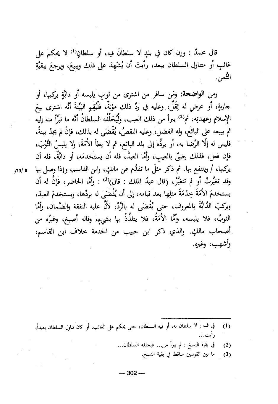 ومن الواضحة: ومن سافر من اشترى من ثوب يلبسه أو دابة يركبها، أو جارية، أو عرض له ثقل، وعليه في رد ذلك مؤنة، فليقم البينة أنه اشترى بيع الإسلام وعهدته، ثم يبرأ من ذلك العيب، وليحلفه السلطان أنه ما تبرأ منه إليه ثم يبيعه على البائع، وله الفضل، وعليه النقص، يقضى له بذلك، فإن لم يجد بينة، فليس له إلا الرضا به، أو يرده إلى بلد البائع، ثم لا يطأ الأمة، ولا يلبس الثوب، فإن فعل، فذلك رضى بالعيب، وأما العبد، فله أن يستخدمه، أو دابة، فله أن يركبها، وينتفع بها. ثم ذكر مثل ما تقدم عن مالك، وابن القاسم، وإذا وصل بها وقد تغيرت أو لم تتغير. قال عبد الملك: قال: وأما الحاضر، فإن له أن يستخدم الأمة خدمة مثلها بعد قيامه، إلى أن يقضى له بردها، ويستخدم العبد، ويركب الدابة بالمعروف، حتى يقضى لع بالرد؛ لأن عليه النفقة والضمان، وأما الثوب، فلا يلبسه، وأما الأمة، فلا يتلذذ بها شيء، وقاله أصبغ، وغيره من أصحاب مالك. والذي ذكر ابن حبيب من الخدمة خلاف ابن القاسم، وأشهب، وغيره.