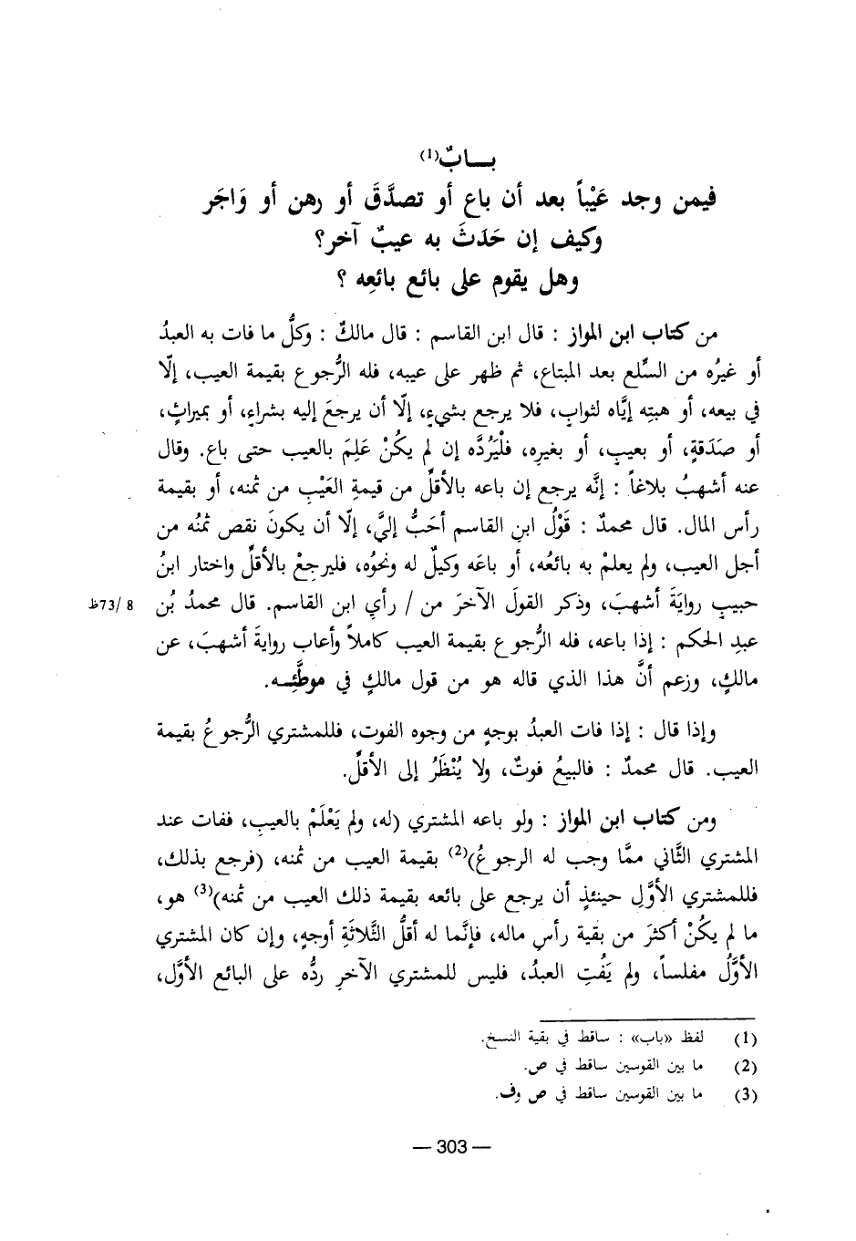 من كتاب ابن المواز: قال ابن القاسم: قال مالك: وكل ما فات به العبد أو غيره من السلع بعد المبتاع، ثم ظهر على عيبه، فله الرجوع بقيمة العيب، إلا في بيعه، أو هبته إياه لثواب، فلا يرجع بشيء، إلا أن يرجع إليه بشراء، أو بميراث، أو صدقة، أو بعيب، أو بغيره، فليرده إن لم يكن علم بالعيب حتى باع. وقال عنه أشهب بلاغًا: إنه يرجع إن باعه بالأقل من قيمة العيب من ثمنه، أو بقيمة رأس المال. قال محمد: قول ابن القاسم أحب إليّ، إلا أن يكون نقص ثمنه من أجل العيب، ولم يعلم به بائعه، أو باعه وكيل له ونحوه، فليرجع بالأقل واختار ابن حبيب رواية أشهب، وذكر القول الآخر من رأي ابن القاسم. قال محمد بن عبد الحكم: إذا باعه، فله الرجوع بقيمة العيب كاملاً وأعاب رواية أشهب، عن مالك، وزعم أن هذا الذي قاله هو من قول مالك في موطئه.