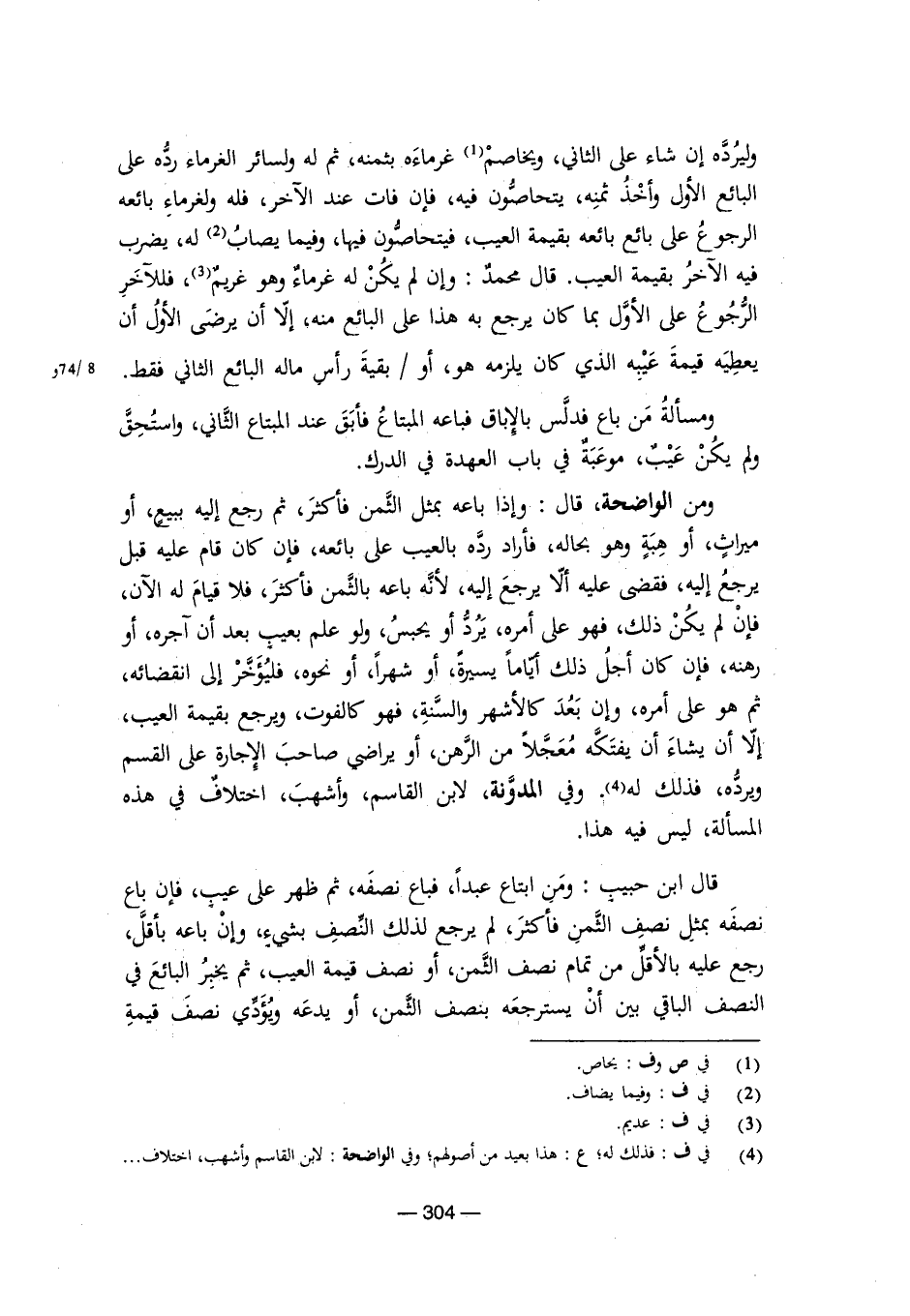 ومن الواضحة، قال: وإذا باعه بمثل الثمن فأكثر، ثم رجع إليه ببيع، أو ميراث، أو هبة وهو بحاله، فأراد رده بالعيب على بائعه، فإن كان قام عليه قبل يرجع إليه، فقضى عليه ألا يرجع إليه؛ لأنه باعه بالثمن فأكثر، فلا قيام له الآن، فإن لم يكن ذلك، فهو على أمره، يرد أو يحبس، ولو علم بعيب بعد أن آجره، أو رهنه، فإن كان أجل ذلك أيامًا يسيرة، أو شهرًا، أو نحوه، فليؤخر إلى انقضائه، ثم هو على أمره، وإن بعد كالأشهر والسنة، فهو كالفوت، ويرجع بقيمة العيب، إلا أن يشاء أن يفتكه معجلاً من الرهن، أو يراضي صاحب الإجارة على القسم ويرده، فذلك له. وفي المدونة لابن القاسم، وأشهب، اختلاف في هذه المسألة، ليس فيه هذا.