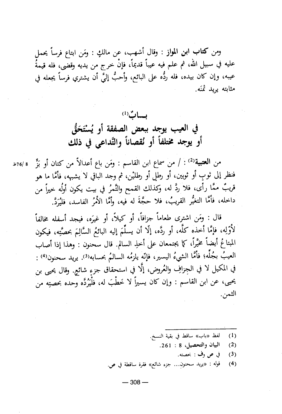 ومن كتاب ابن المواز: وقال أشهب، عن مالك: ومن ابتاع فرسًا يحمل عليه في سبيل الله، ثم علم فيه عيبًا قديمًا، فإن خرج من يديه وقضى، فله قيمة عيبه، وإن كان بيده، فله رده على البائع، وأحب إليّ أن يشتري فرسًا يجعله في مثابته يريد ثمنه.