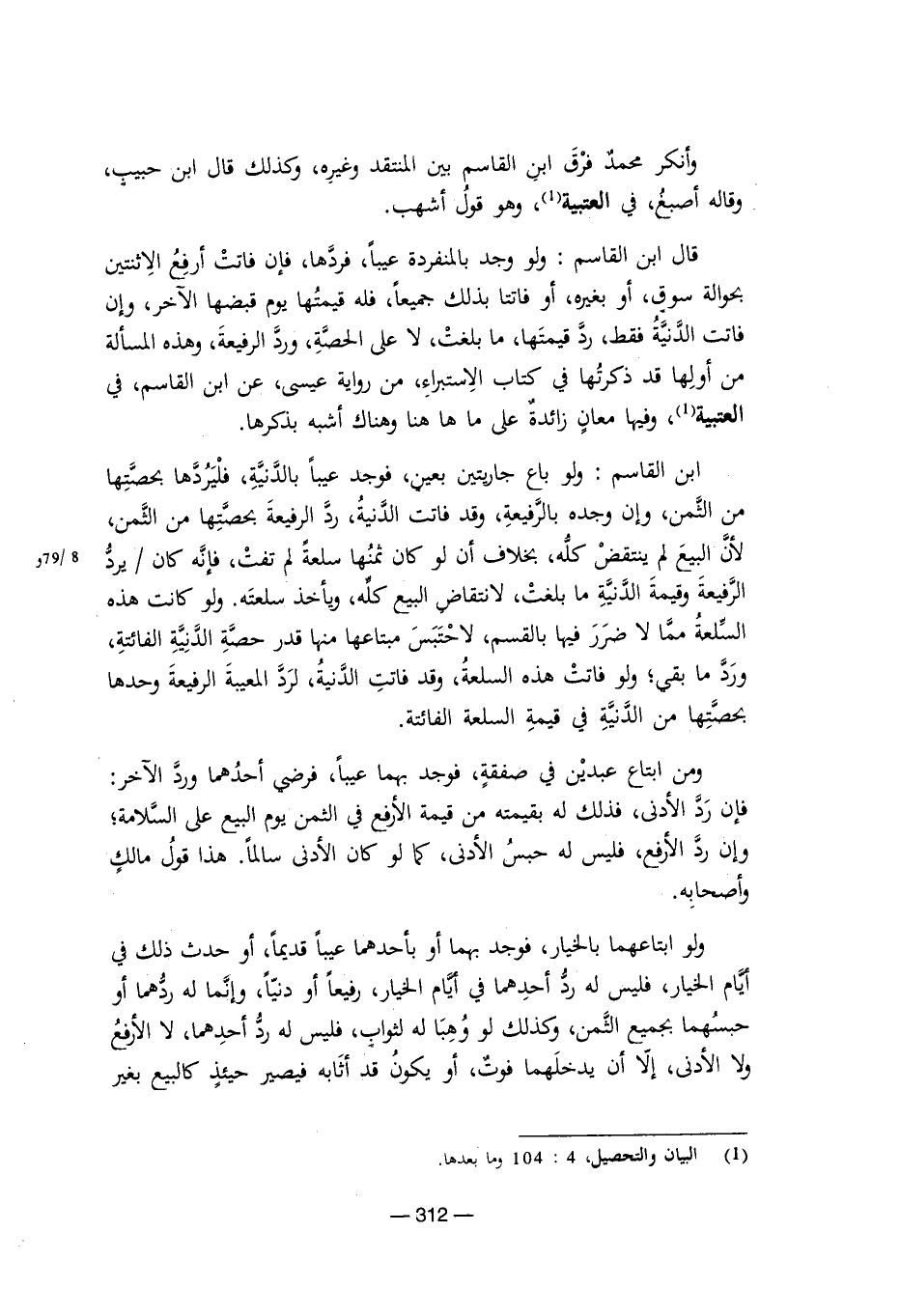 ابن القاسم: ولو باع جاريتين بعين، فوجد عيبًا بالدنية، فليردها بحصتها من الثمن، وإن وجده بالرفيعة، وقد فاتت الدنية، رد الرفيعة بحصتها من الثمن، لأن البيع لم ينتقض كله، بخلاف أن لو كان ثمنها سلعة لم تفت، فإنه كان يرد الرفيعة وقيمة الدنية ما بلغت، لانتقاض البيع كله، ويأخذ سلعته. ولو كانت هذه السلعة مما لا ضرر فيها بالقسم، لاحتبس مبتاعها منها قدر حصة الدنية الفائتة، ورد ما بقي، ولو فاتت هذه السلعة، وقد فاتت الدنية، لرد المعيبة الرفيعة وحدها بحصتها من الدنية في قيمة السلعة الفائتة.