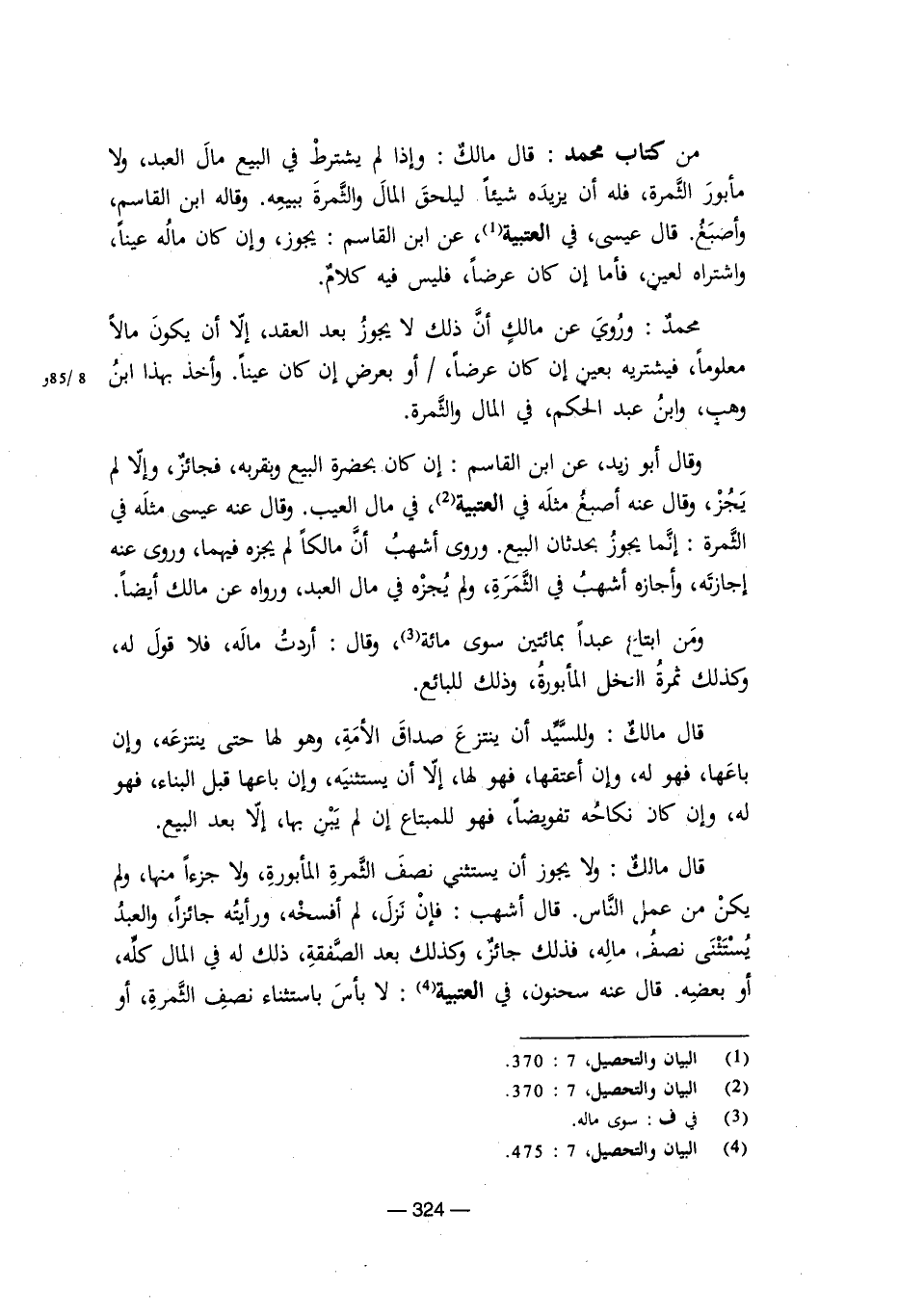 قال مالك: ولا يجوز أن يستثني نصف الثمرة المأبورة، ولا جزءًا منها، ولم يكن من عمل الناس. قال أشهب: فإن نزل، لم أفسخه، ورأيته جائزًا، والعبد يستثنى نصف ماله، فذلك جائز، وكذلك بعد الصفقة، ذلك له في المال كله، أو بعضه. قال عنه سحنون في العتبية: لا بأس باستثناء نصف الثمرة، أو