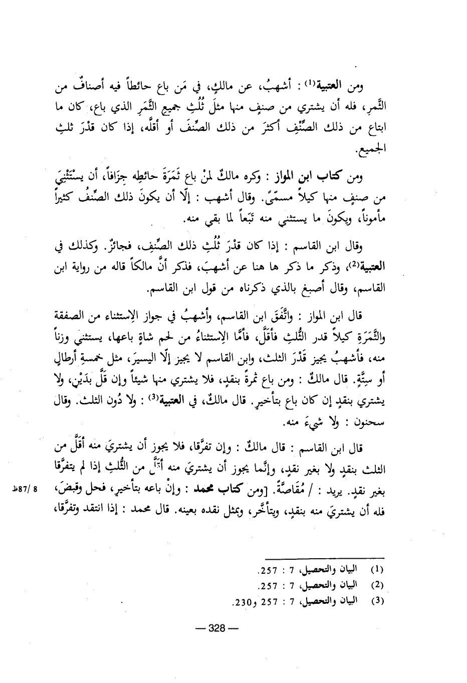 قال ابن المواز: واتفق ابن القاسم، وأشهب في جواز الاستثناء من الصفقة والثمرة كيلاً قدر الثلث فأقل، فأما الاستثناء من لحم شاة باعها، يستثني وزنًا منه، فأشهب يجيز قدر الثلث، وابن القاسم لا يجيز إلا اليسير، مثل خمسة أرطال أو ستة. قال مالك: ومن باع ثمرة بنقد، فلا يشتري منها شيئًا وإن قل بدين، ولا يشتري بنقد إن كان باع بتأخير. قال مالك في العتبية: ولا دون الثلث. وقال سحنون: ولا شيء منه.