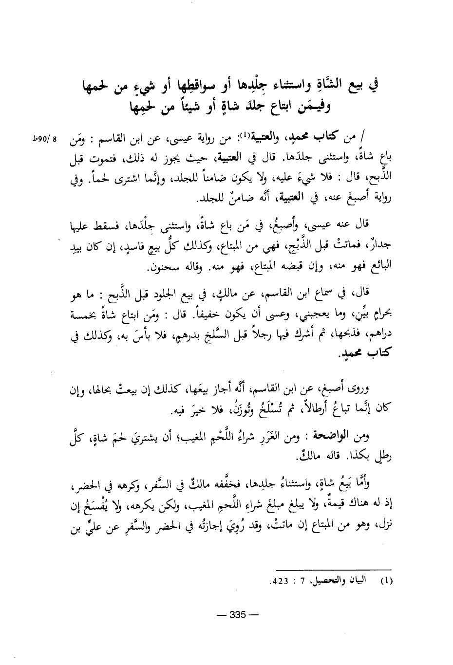 قال في سماع ابن القاسم، عن مالك في بيع الجلود قبل الذبح. ما هو بحرام بين، وما يعجبني، وعسى أن يكون خفيفًا. قال: ومن ابتاع شاة بخمسة دراهم فذبحها، ثم أشرك فيها رجلاً قبل السلخ بدرهم، فلا بأس به، وكذلك في كتاب محمد.