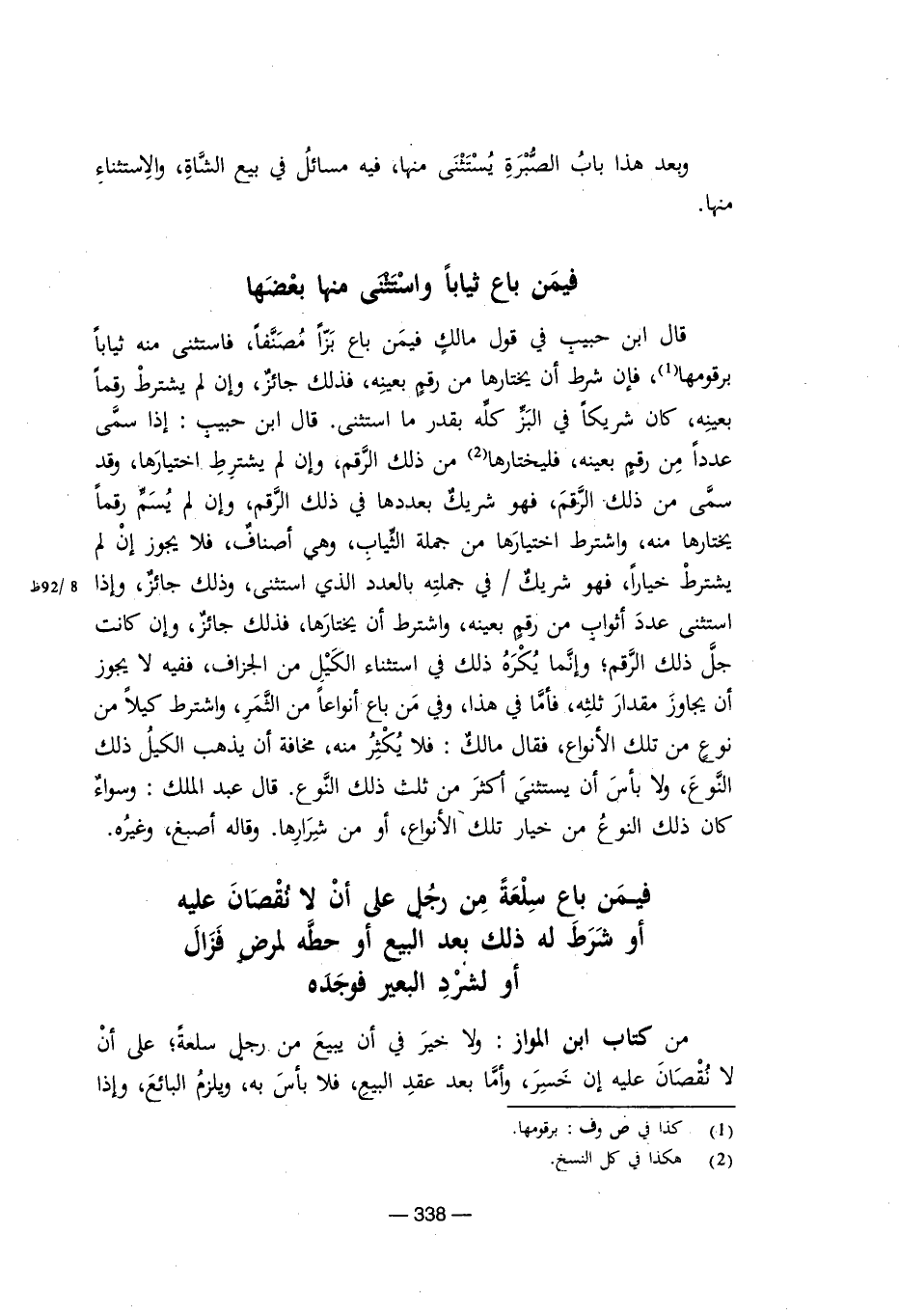 قال ابن حبيب في قول مالك فيمن باع بزًا مصنفًا، فاستثنى منه ثيابًا برقومها، فإن شرط أن يختارها من رقم بعينه، فذلك جائز، وإن لم يشترط رقمًا بعينه، كان شريكًا في البز كله بقدر ما استثنى. قال ابن حبيب: إذا سمى عددًا من رقم بعينه، فليختارها من ذلك الرقم، وإن لم يشترط اختيارها، وقد سمى من ذلك الرقم، فهو شريك بعددها في ذلك الرقم، وإن لم يسم رقمًا يختارها منه، واشترط اختيارها من جملة الثياب، وهي أصناف، فلا يجوز إن لم يشترط خيارًا، فهو شريك في جملته بالعدد الذي استثنى، وذلك جائز، وإذا استثنى عدد أثواب من رقم بعينه، واشترط أن يختارها، فذلك جائز، وإن كانت جل ذلك الرقم، وإنما يكره ذلك في استثناء الكيل من الجزاف، ففيه لا يجوز أن يجاوز مقدار ثلثه، فأما في هذا، وفي من باع أنواعًا من الثمر، واشترط كيلاً من نوع من تلك الأنواع، فقال مالك: فلا يكثر منه، مخافة أن يذهب الكيل ذلك النوع، ولا بأس أن يستثني أكثر من ثلث ذلك النوع. قال عبد الملك: وسواء كان ذلك النوع من خيار تلك الأنواع، أو من شرارها. وقاله أصبغ، وغيره.