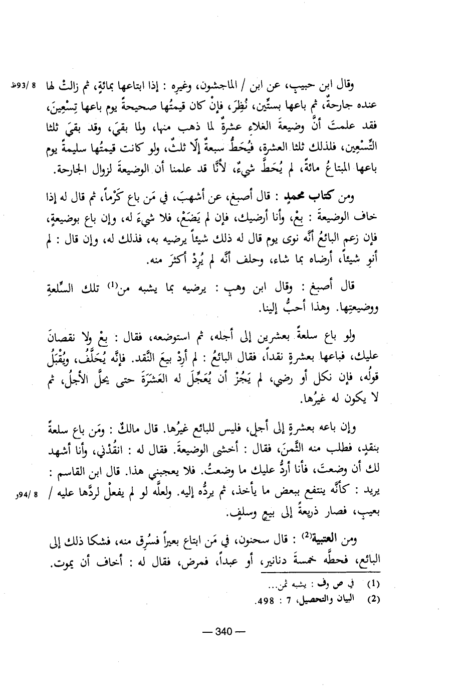 ومن العتبية: قال سحنون، في من ابتاع بعيرًا فسرق منه، فشكا ذلك إلى البائع، فحطه خمسة دنانير، أو عبدًا، فمرض، فقال له: أخاف أن يموت.