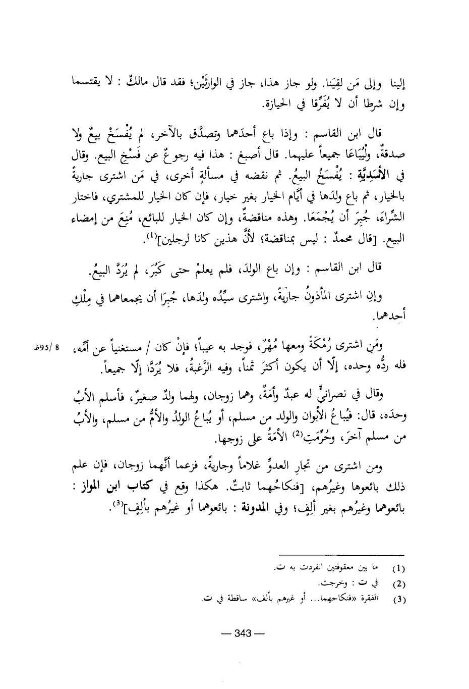 قال ابن القاسم: وإذا باع أحدهما وتصدق بالآخر، لم يفسخ بيع ولا صدقة، وليباعا جميعًا عليهما. قال أصبغ: هذا فيه رجوع عن فسخ البيع. وقال في الأسدية: يفسخ البيع. ثم نقضه في مسألة أخرى، في من اشترى جارية بالخيار، ثم باع ولدها في أيام الخيار بغير خيار، فإن كان الخيار للمشتري، فاختار الشراء، جبر أن يجمعا. وهذه مناقضة، وإن كان الخيار للبائع، منع من إمضاء البيع. قال محمد: ليس بمناقضة؛ لأن هذين كانا لرجلين.